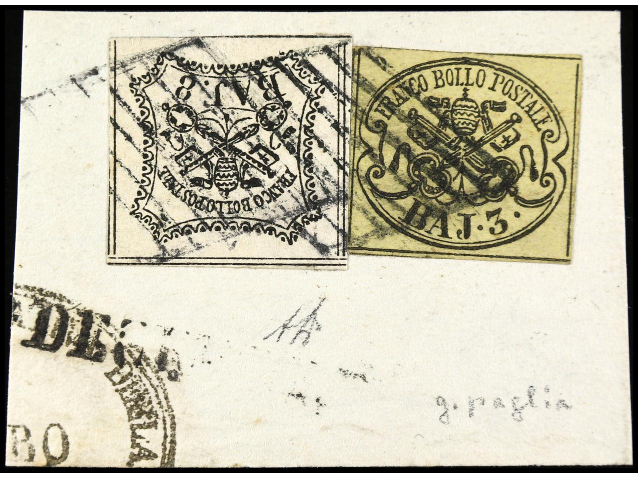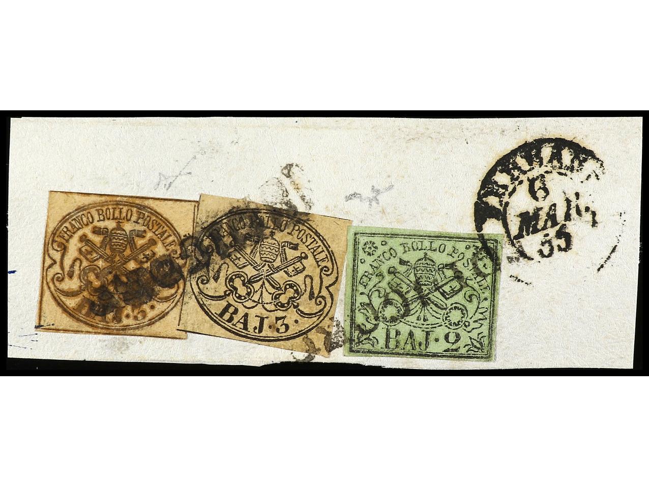 ITALIA ANTIGUOS ESTADOS: ESTADOS PONTIFICIOS. 1855. Fragmento con sellos de 2 baj. verde, 3 baj. bistre, 3 baj. bistre ´oleoso´, mat. lineal CODIGORO. Sa.3, 4, 4e. (Image1)