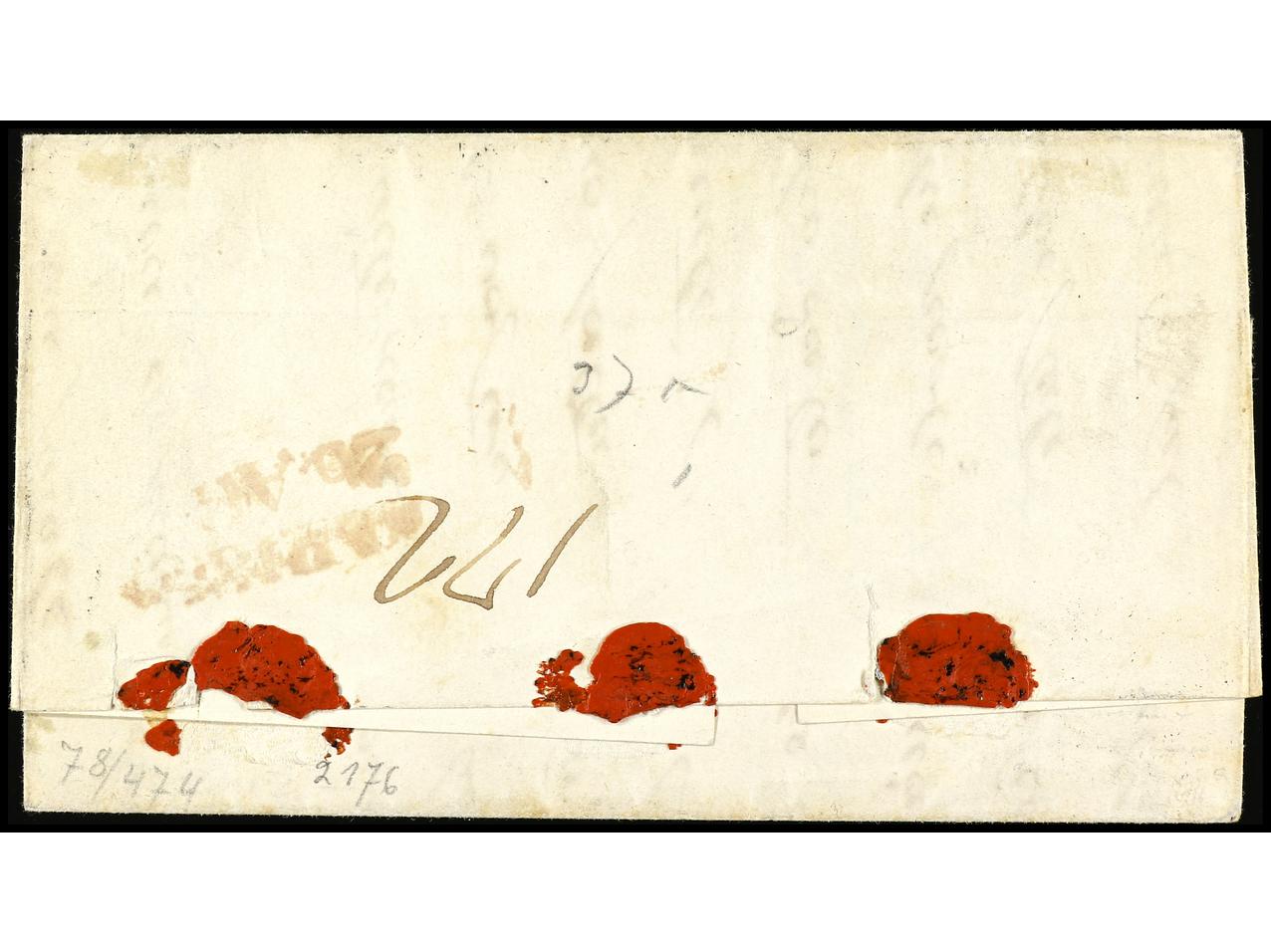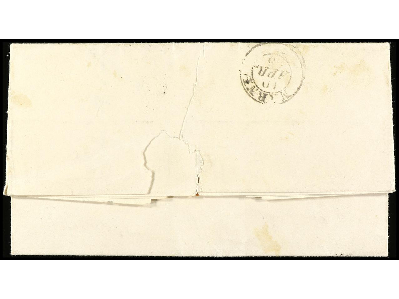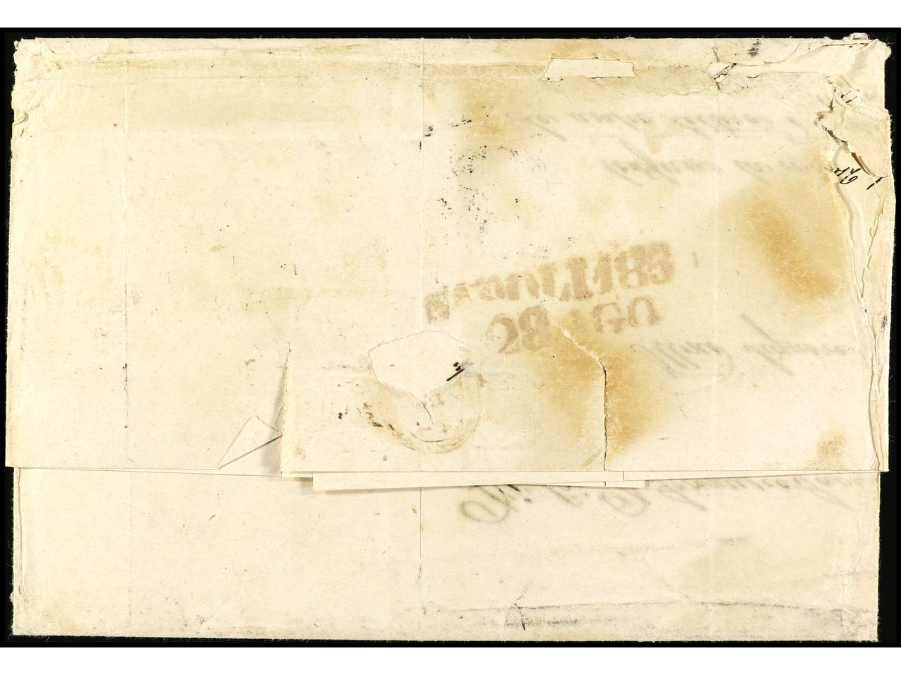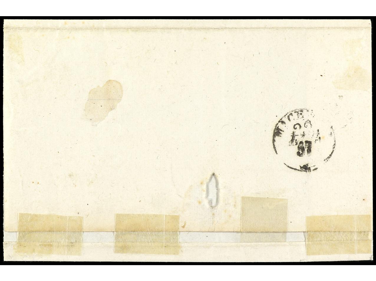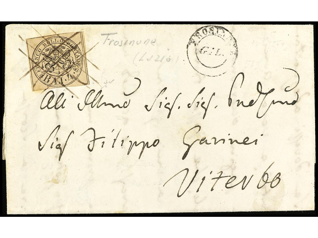 ITALIA ANTIGUOS ESTADOS: ESTADOS PONTIFICIOS. 1854. FROSINONE (Lazio) a VITERBO. 4 baj. sepia, mat. manuscirto ´barras entrecruzadas´. PRECIOSO y RARO. Sa.5.