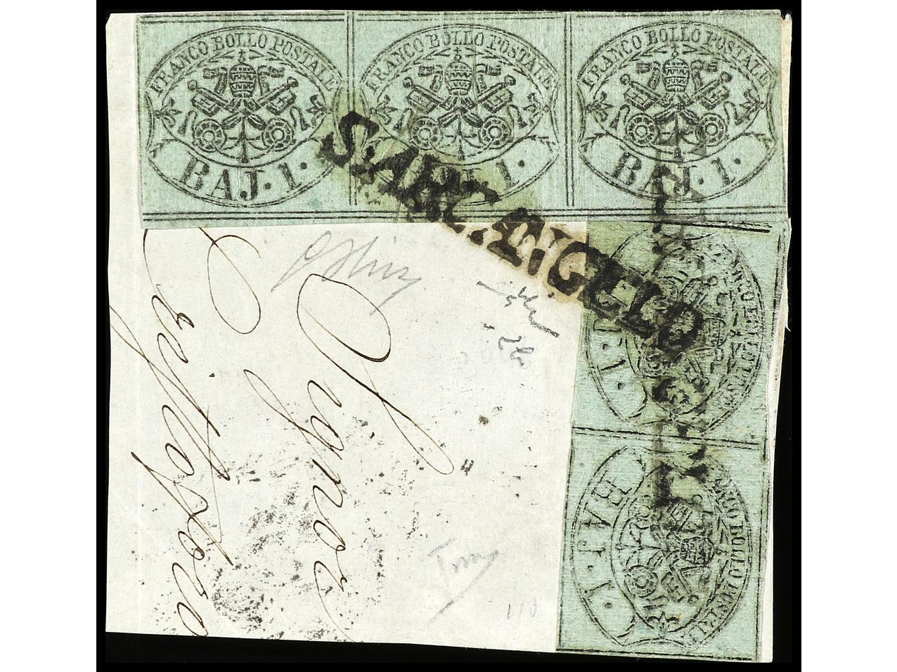 ITALIA ANTIGUOS ESTADOS: ESTADOS PONTIFICIOS. 1855. 1 baj. verde ´oleoso´ pareja y tira de tres sobre fragmento, mat. lineal S. ARCANGELO. Sa.2b.