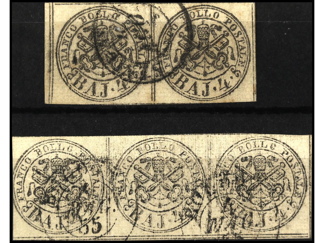 ITALIA ANTIGUOS ESTADOS: ESTADOS PONTIFICIOS. 1855. 4 baj. sepia ´oleoso´, pareja (firmado SORANI) y tira de tres. Sa.5b (5). (Image1)