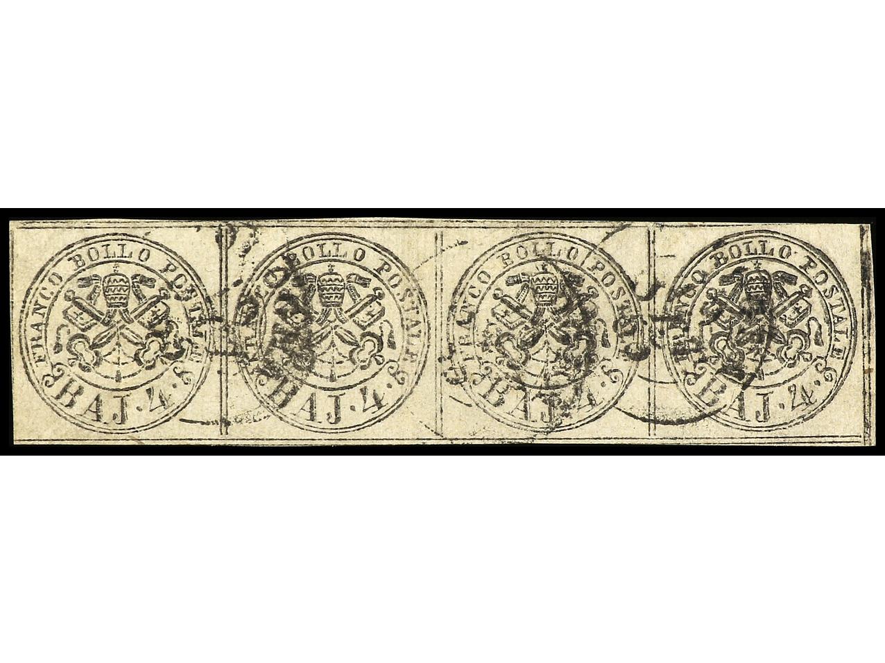 ITALIA ANTIGUOS ESTADOS: ESTADOS PONTIFICIOS. 1855. 4 baj. sepia ´oleoso´, tira de cuatro, mat. fechador de Bologna. Leve pliegue vertical que afecta a un sello. RARO. Sa.5b (4). (Image1)