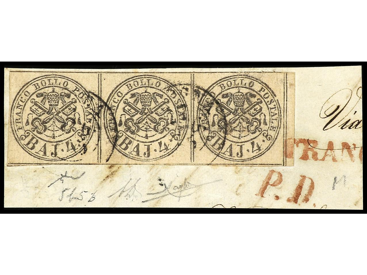 ITALIA ANTIGUOS ESTADOS: ESTADOS PONTIFICIOS. 1855. 4 baj. bistre ´oleoso´, tira de tres sobre fragmento, mat. fechador de Bologne. Firmado RAYBAUDI. Sa.5b (3).