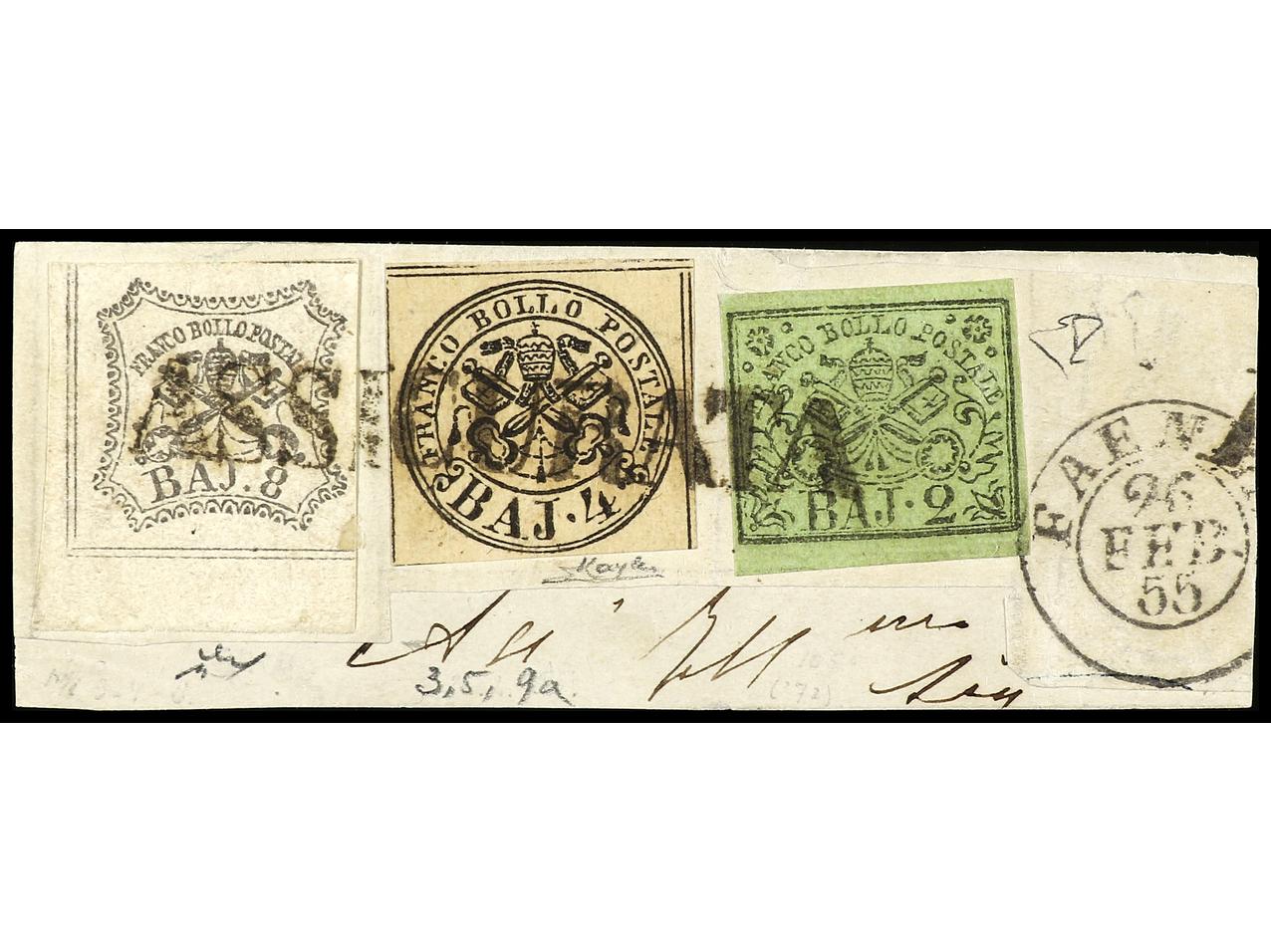 ITALIA ANTIGUOS ESTADOS: ESTADOS PONTIFICIOS. 1855. 2 baj. verde, 4 baj. bistre y 8 baj. blanco ´oleoso´ sobre pequeño fragmento, mat. lineal ASSIGURATA de FAENZA. Firmado E. DIENA. Sa.3, 5, 9a. (Image1)