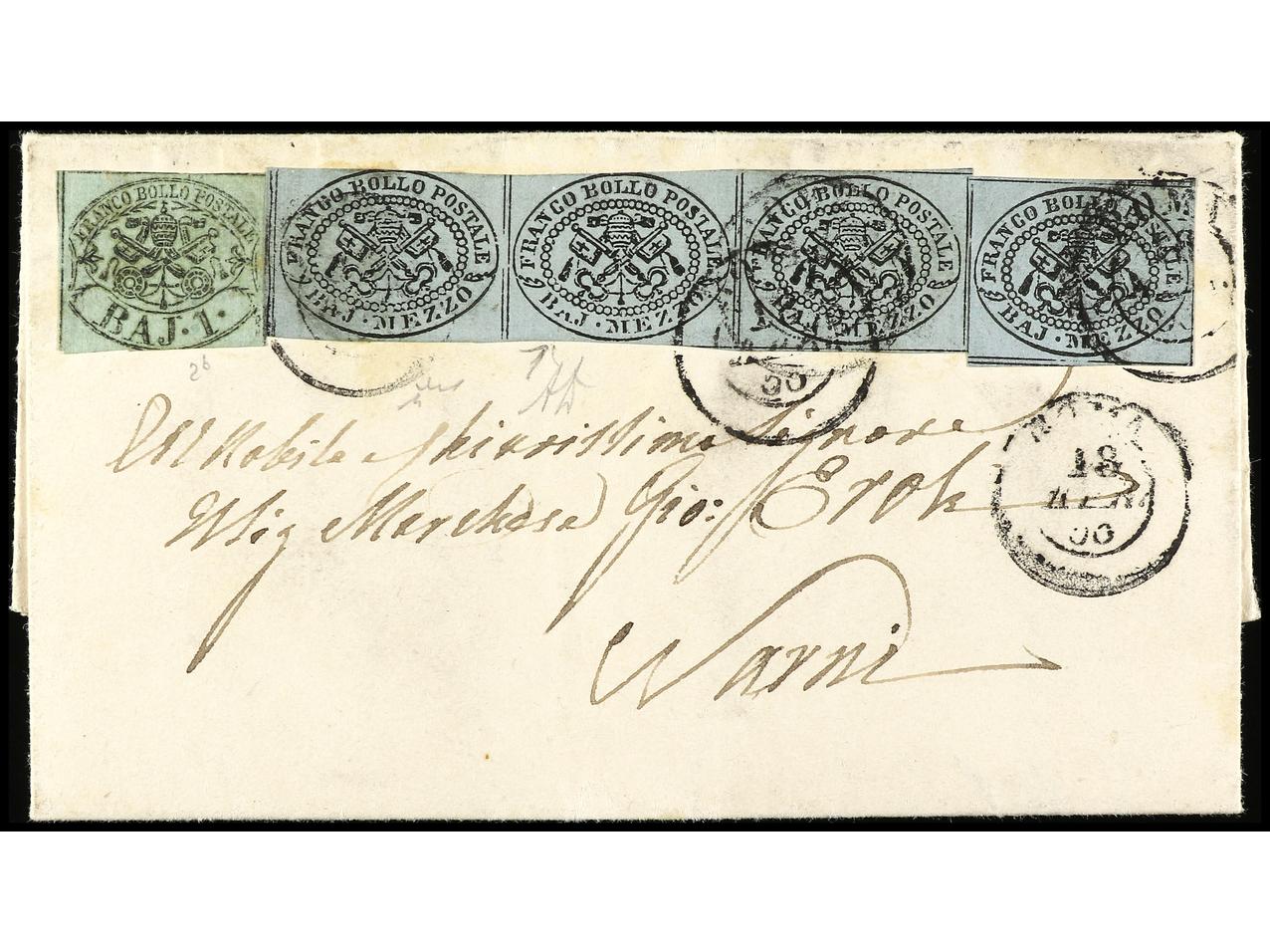 ITALIA ANTIGUOS ESTADOS: ESTADOS PONTIFICIOS. 1855. ROMA a NARNI. 1/2 baj. gris sello y tira de tres y 2 baj. verde ´oleoso´. Rara combinacion de franqueo. Sa.1 (4) y 2b. (Image1) (Image2)