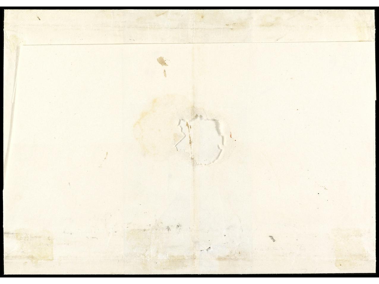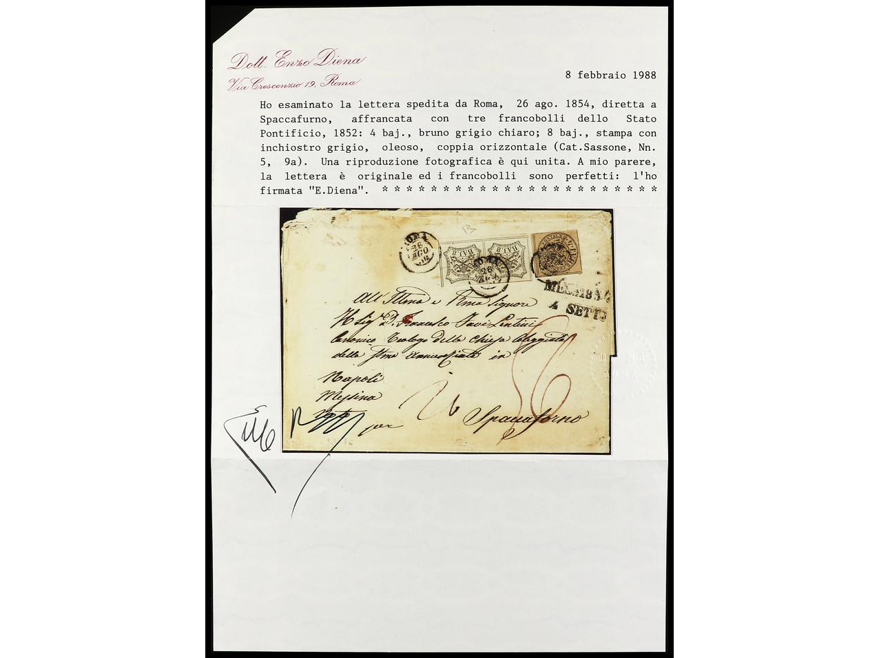 ITALIA ANTIGUOS ESTADOS: ESTADOS PONTIFICIOS. 1854. ROMA a SPACCAFURNO. 4 baj. bistre y 8 baj. blanco (2) ´oleoso´. Cortes de desinfección. Inusual franqueo. Cert. E. DIENA. Sa.5, 9a (2). (Image1) (Image2)