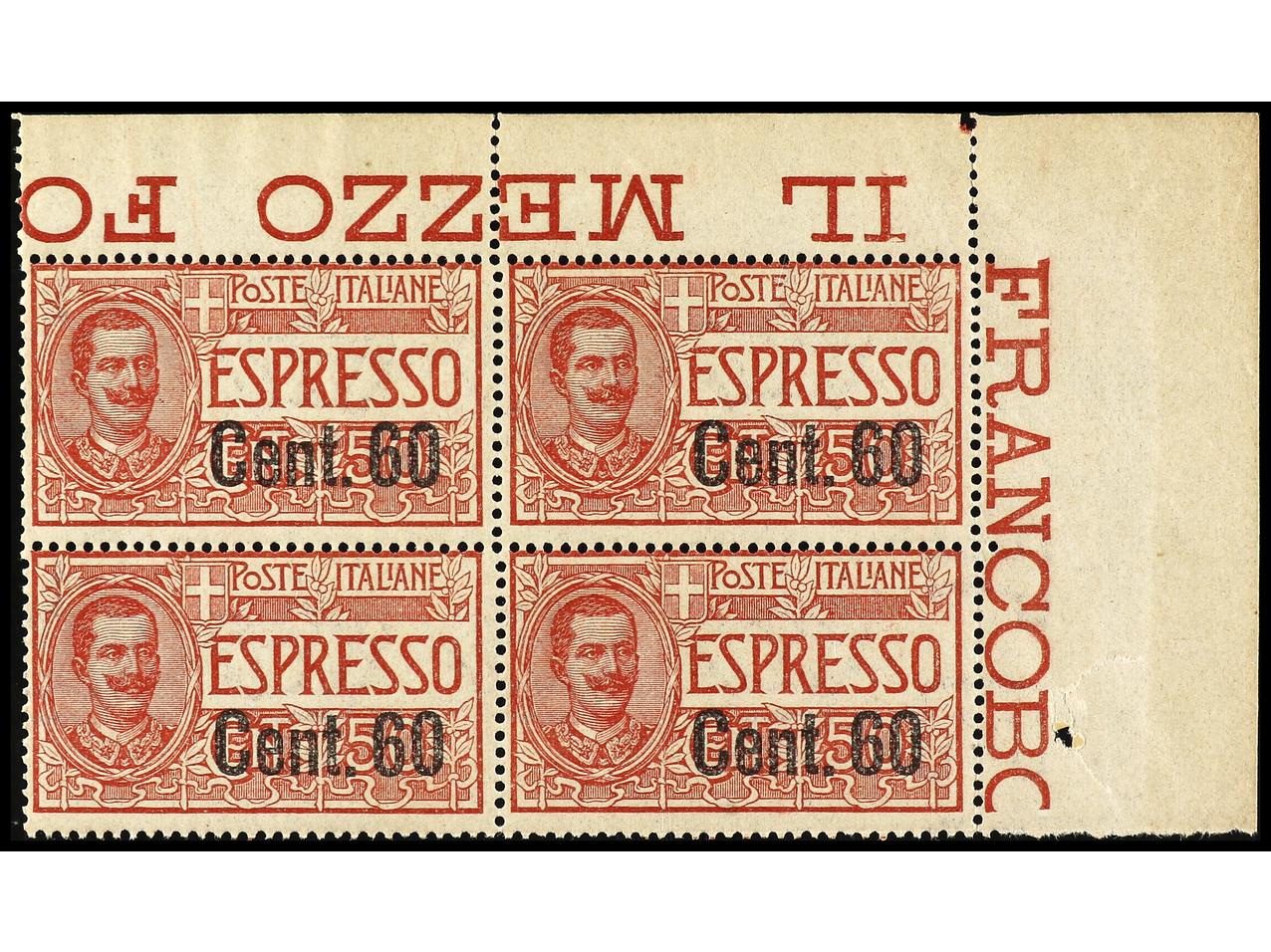 ITALIA. 1922. 60 cts. s. 50 cts. rojo. Bloque de cuatro esquina de pliego. MAGNÍFICO. Yv.E-6. Cat. 1.125€. (Image1)