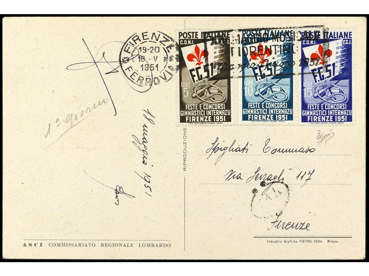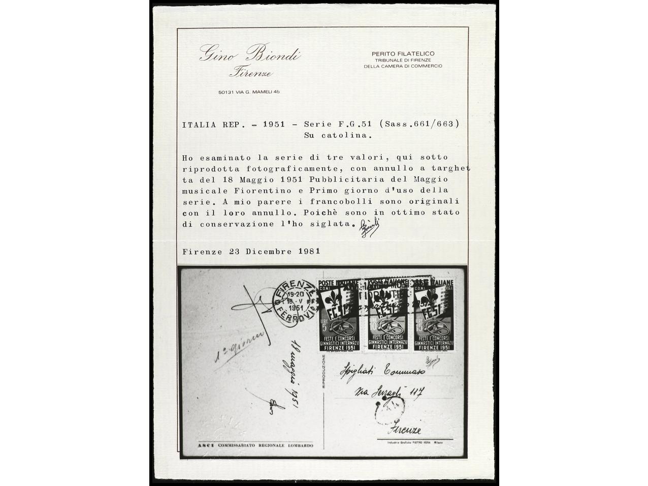 ITALIA. 1951 (18/5). SERIE COMPLETA, 3 valores en tarjeta postal con mat. primer dia. Cert. G. BIONDI. Yv.559/601, Sa. 661/3. Cat. Sa. 2.750€.