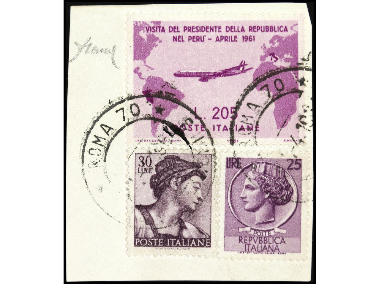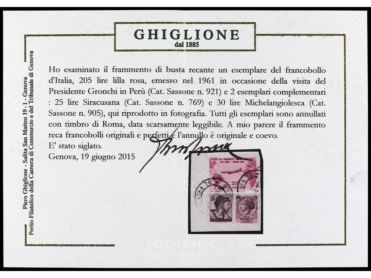 ITALIA. 1961. Gronchi rosa. 205 l. sobre pequeño fragmento con valores complementarios de 25 y 30 l. Mat. fechador ROMA. Cert. GHIGLIONE. Yv.847A, Sa. 921.