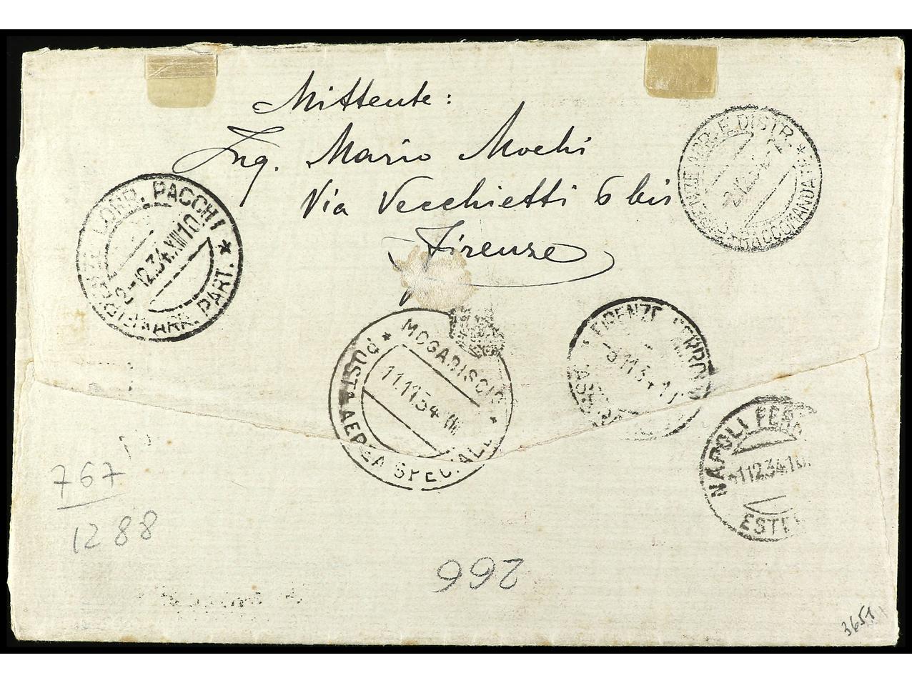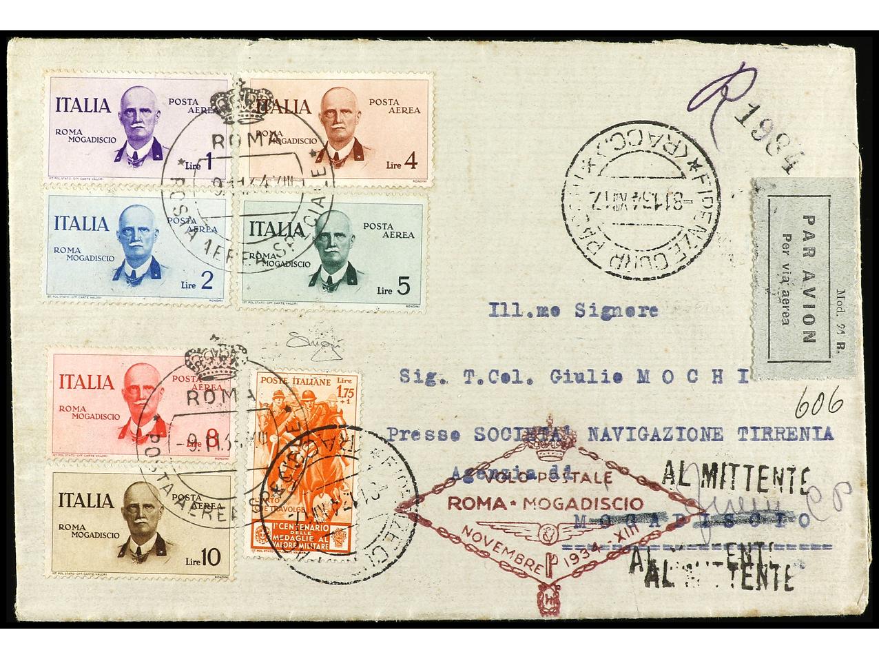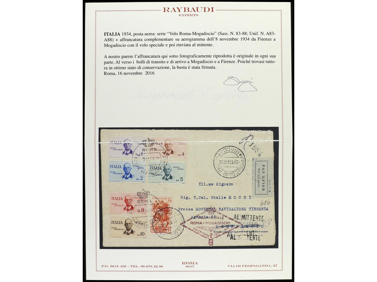 ITALIA. 1934. ROMA a MOGADISCIO. SERIE COMPLETA de 6 valores, más valor complementario sobre aerograma de FIRENZE a MOGADISCIO. Al dorso tránsido y llegada RARA. Cert. RAYBAUDI. Yv.Av. 78/83, Sa. 83/8. Cat. Sa. 3.850€. (Image1) (Image2)