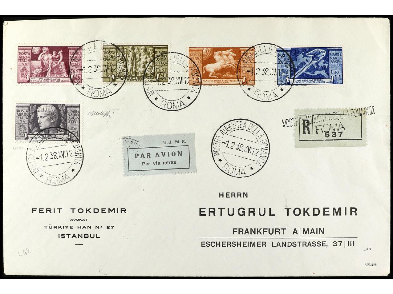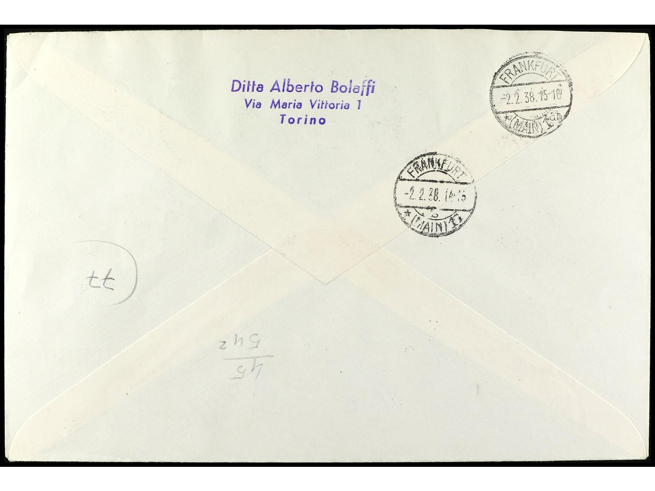 ITALIA. 1938. Certificado de ROMA a FRANKFURT con la SERIE COMPLETA de correo aéreo. Al dorso llegada. Muy bonita. Firmada A. BOLAFFI y G. COLLA. Yv.Av. 102/6, Sa. A 106/10. (Image1) (Image2)
