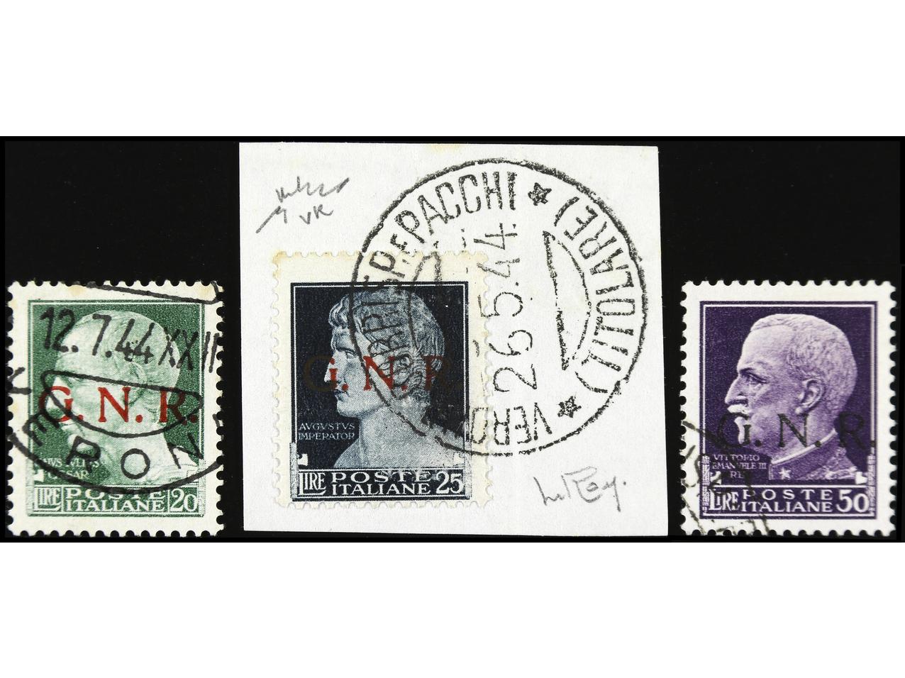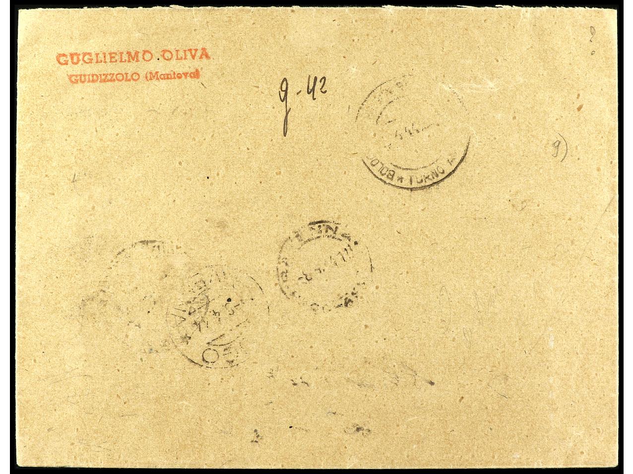 ITALIA. 7,70 l. azul verde y sepia, sobre fragmento con valor complementario y mat. especial. Cert. E. DIENA. Yv.Av. 25, Sa. PA 25. Cat. 500€.