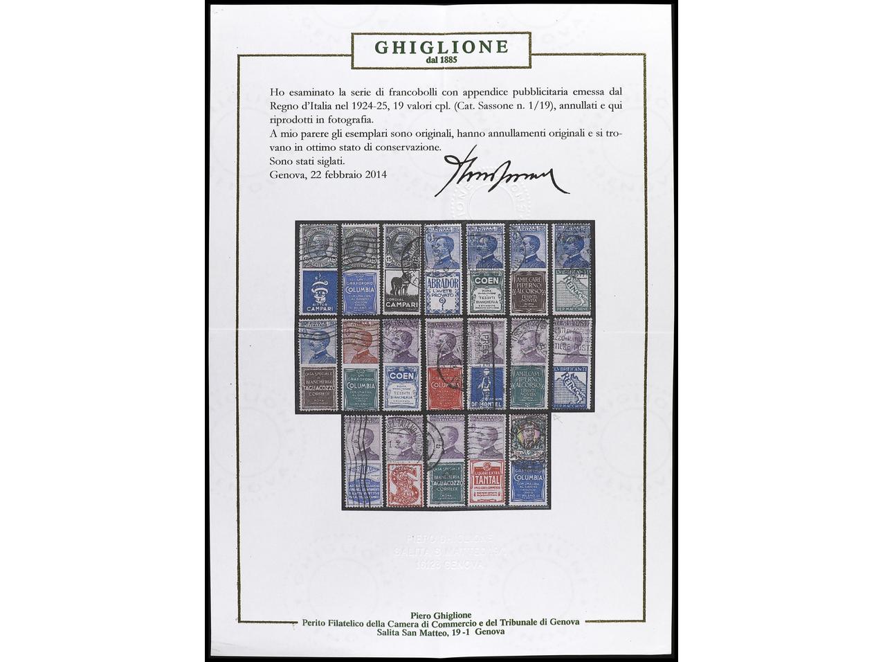 ITALIA. PUBLICIDAD. SERIE COMPLETA, 19 valores. RARA. Cert. GHIGLIONE. Sa.1/19. Cat. 6.000€. (Image1) (Image2)