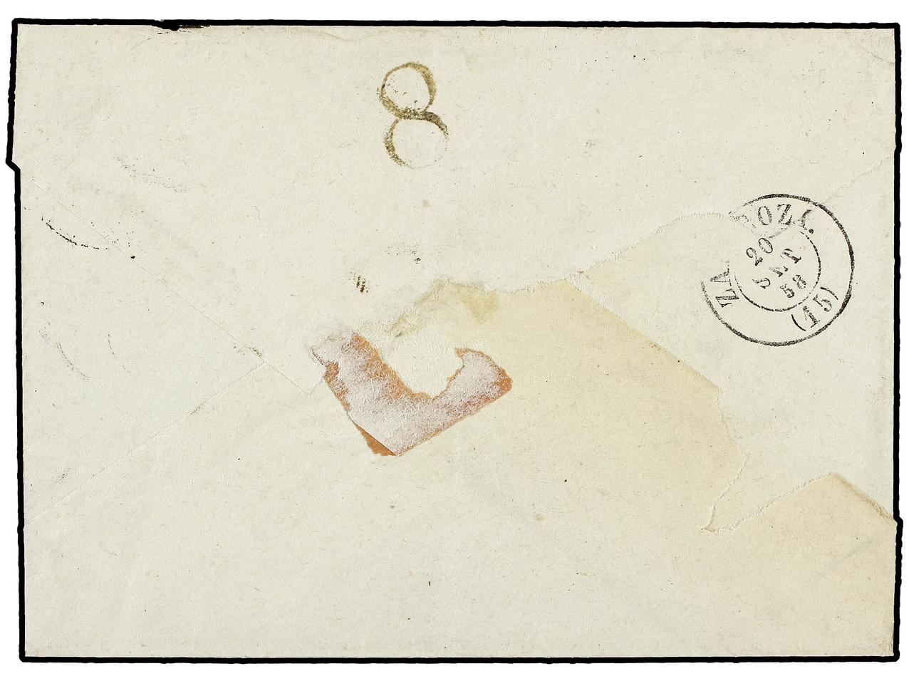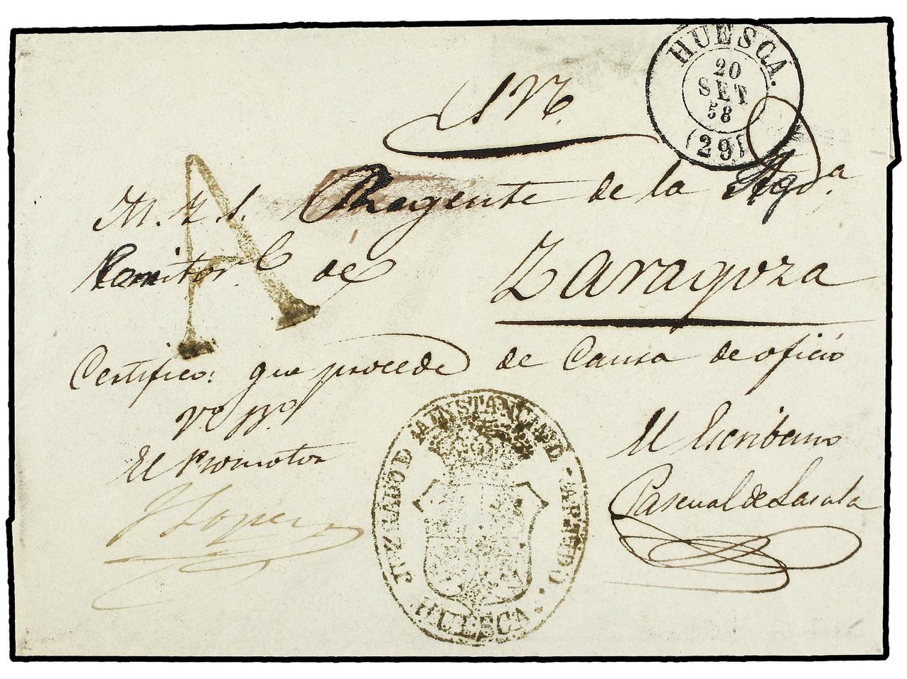 ESPAÑA: PREFILATELIA. 1858. HUESCA a ZARAGOZA. Marca A de HUESCA en negro. MAGNÍFICA. (Image1) (Image2)