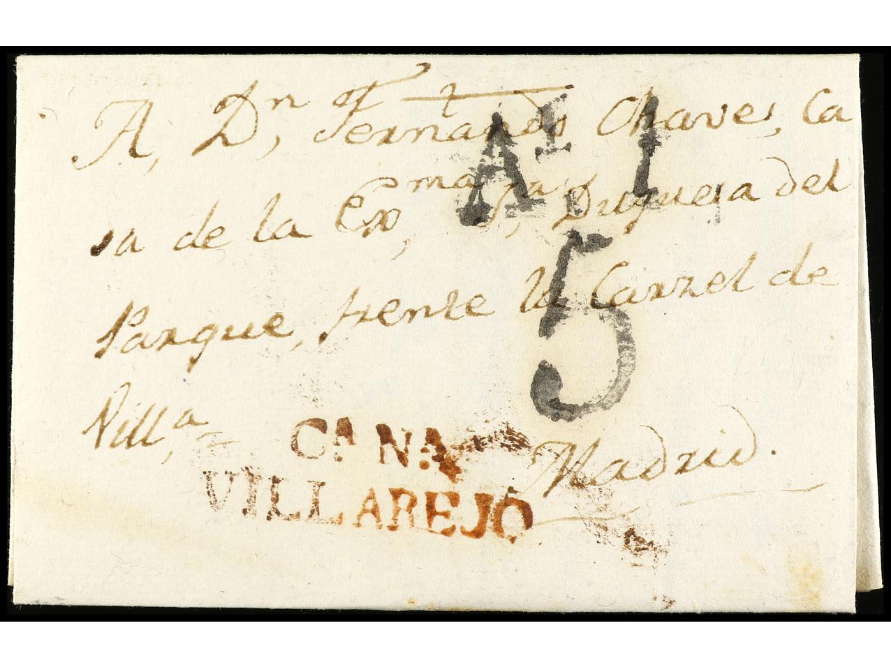 ESPAÑA: PREFILATELIA. 1828. VILLAREJO a MADRID. Marca CA.NA/VILLAREJO en rojo. PRECIOSA. (Image1) (Image2)