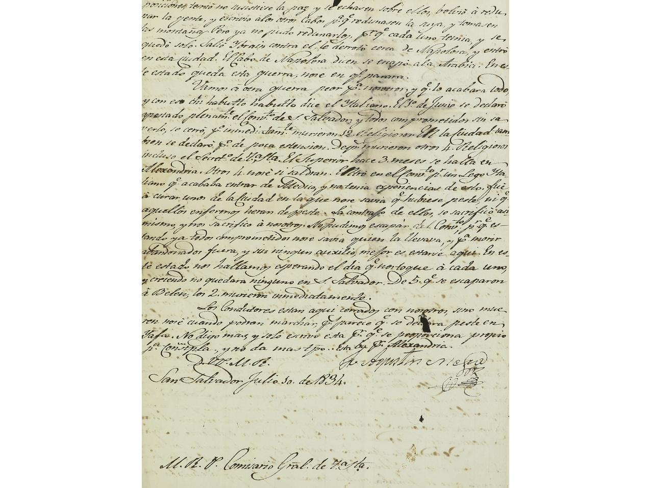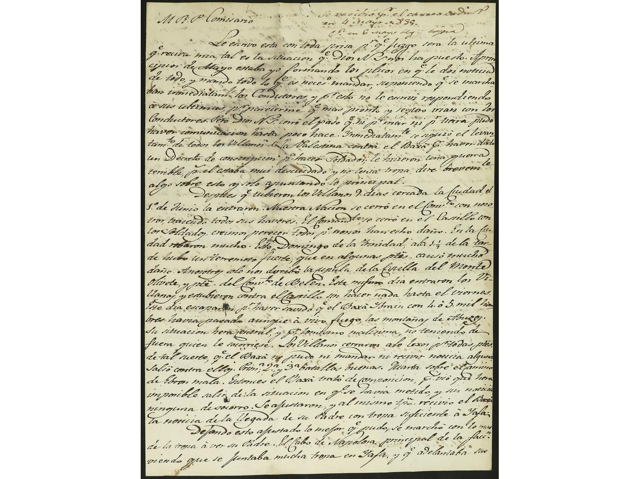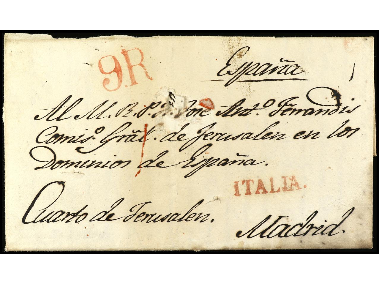 ESPAÑA: PREFILATELIA. CONVENTO DE SAN SALVADOR. JERUSALEM (Palestina) a MADRID. Carta completa con texto circulada por el correo y desinfectada en el Lazareto de San Rocco en Livorno (marca al dorso). Marca ITALIA en rojo de Madrid (nº