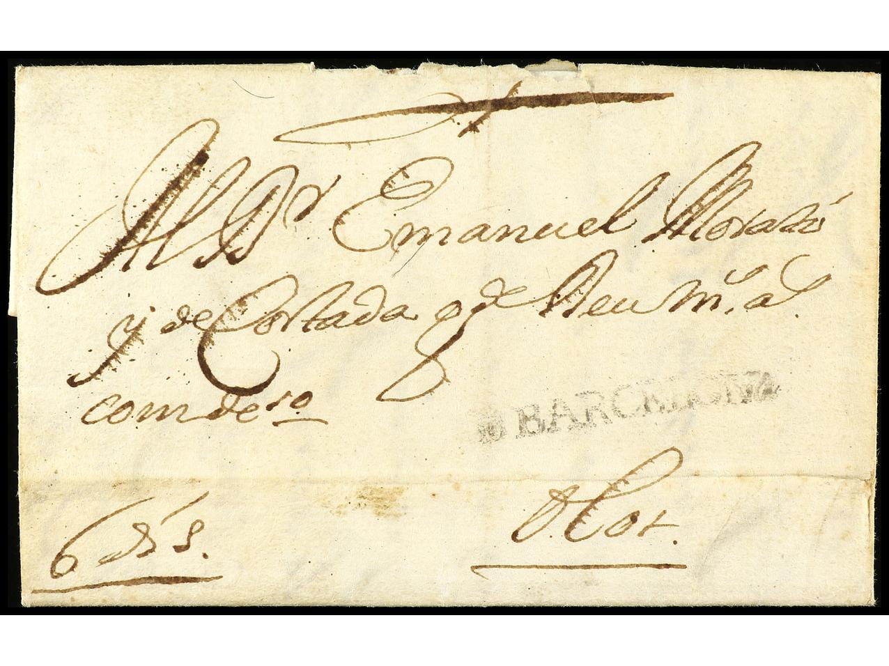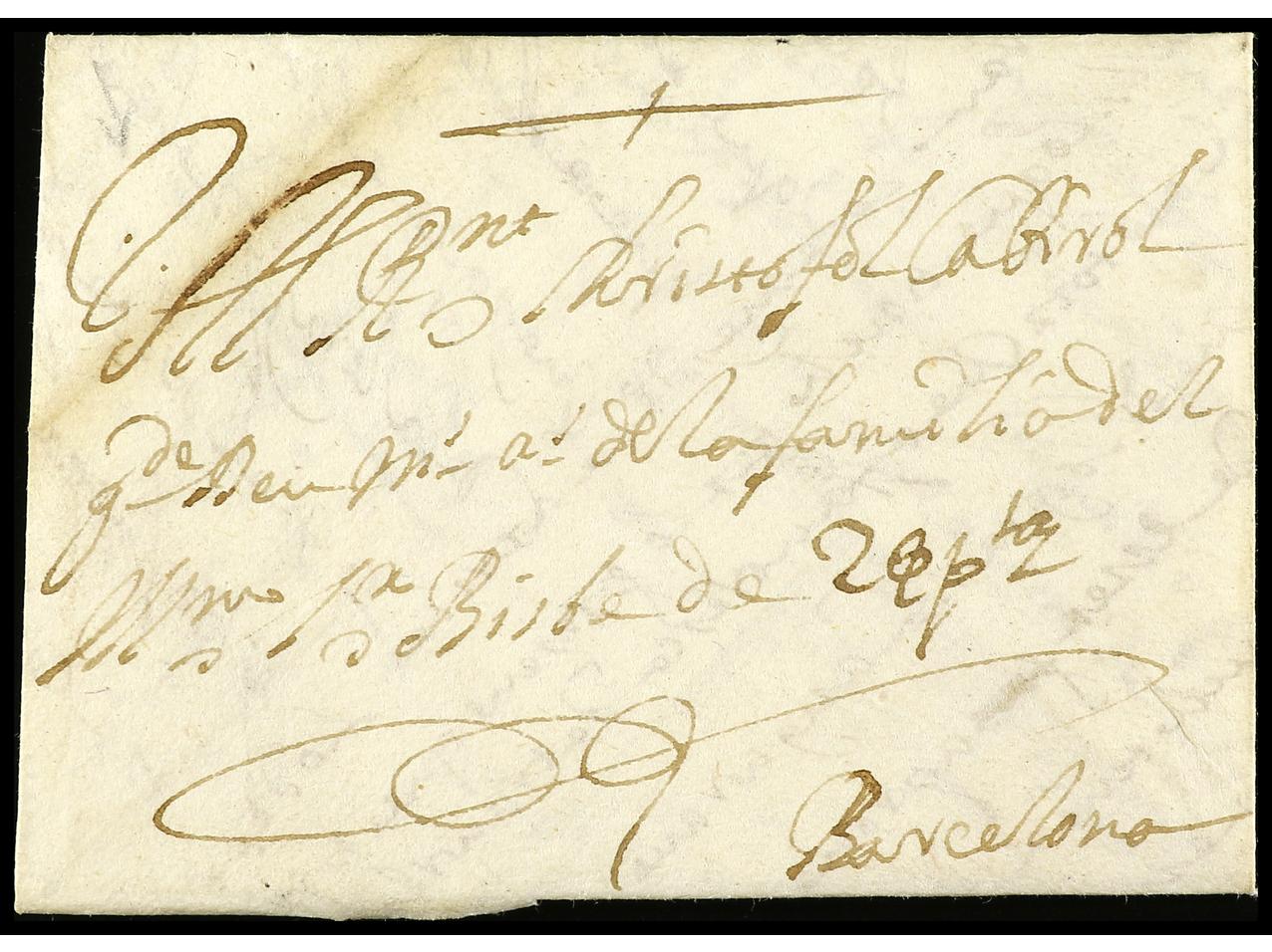ESPAÑA: PREFILATELIA. 1718. BARCELONA a OLOT. Marca DE BARCELONA (nº 2). Porteo manuscrito ´6 dineros´. RARÍSIMA. (Image1) (Image2)