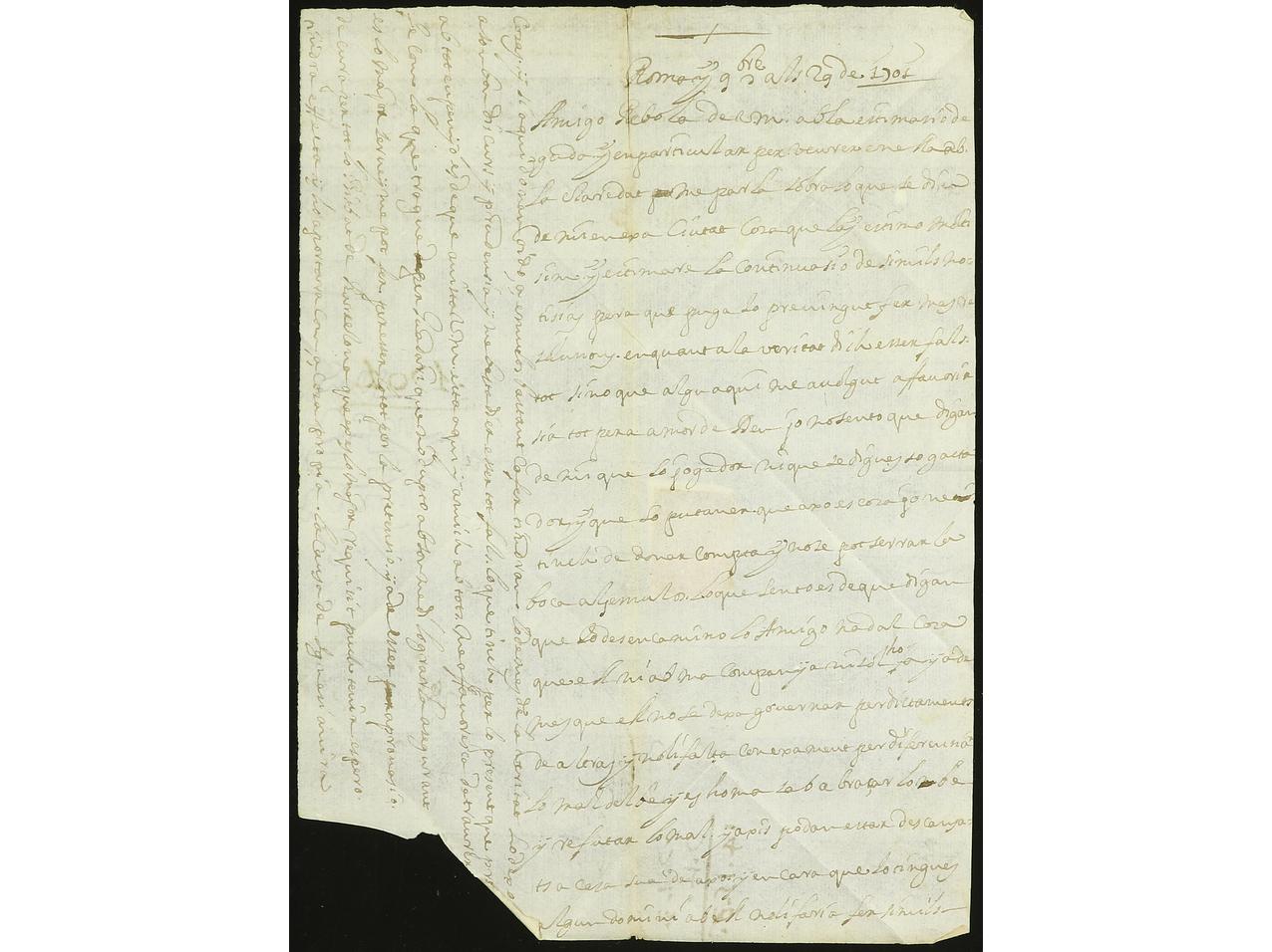 ESPAÑA: PREFILATELIA. 1701. ROMA a BARCELONA. Circulada por el correo y dirigida al Obispo de Barcelona escrita en catalán, porte manuscrito ´2Qpta.´.