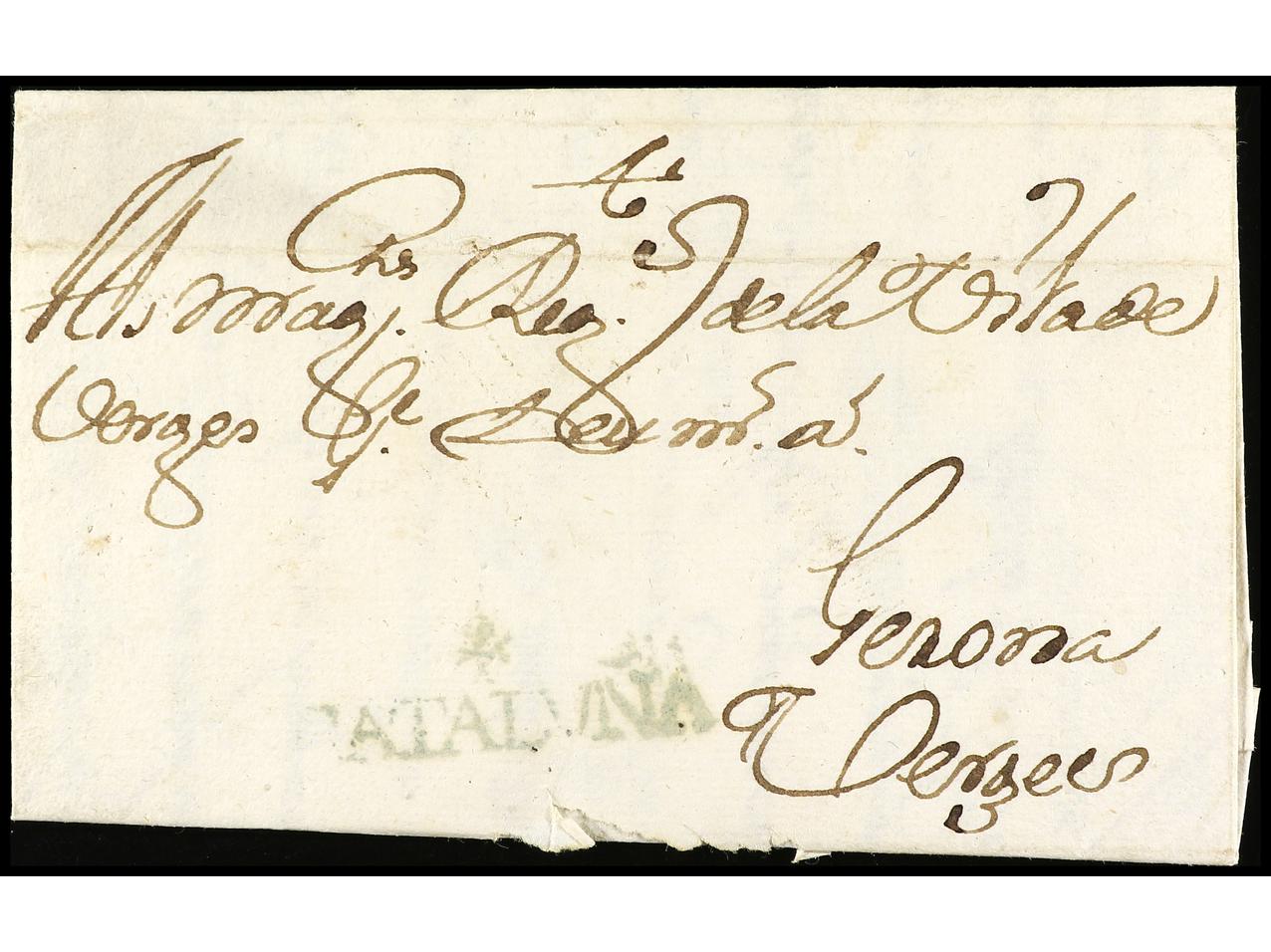 ESPAÑA: PREFILATELIA. 1761 (13 junio). BARCELONA a VERGES. Marca +/CATALUÑA (nº 28) en color azul verdoso. RARA, no reseñada en este color.