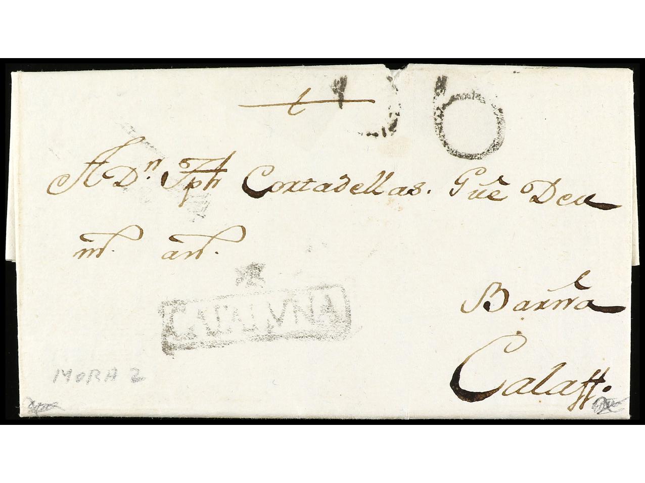 ESPAÑA: PREFILATELIA. 1781 (23 julio). ASCÓ a CALAF. Marca +/CATALUÑA (nº 2) de MORA DE EBRO. (Image1) (Image2)