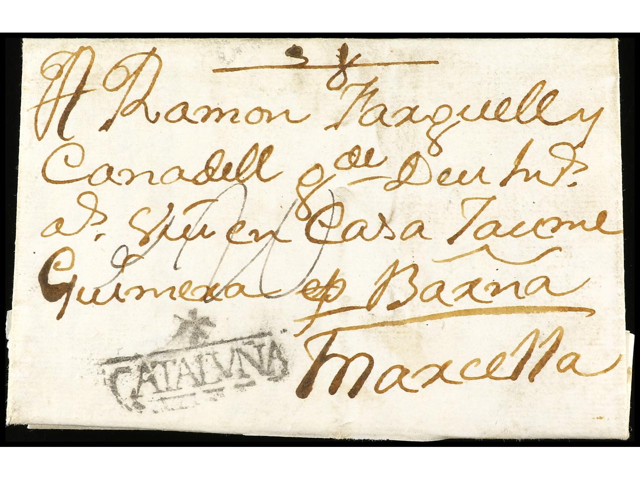 ESPAÑA: PREFILATELIA. 1767. BERGA a MARSELLA. Marca +/CATALUÑA (nº 2). RARA y de excelente estampación. (Image1) (Image2)