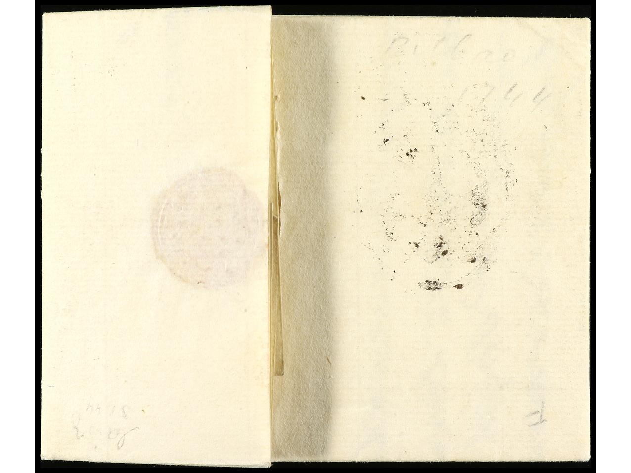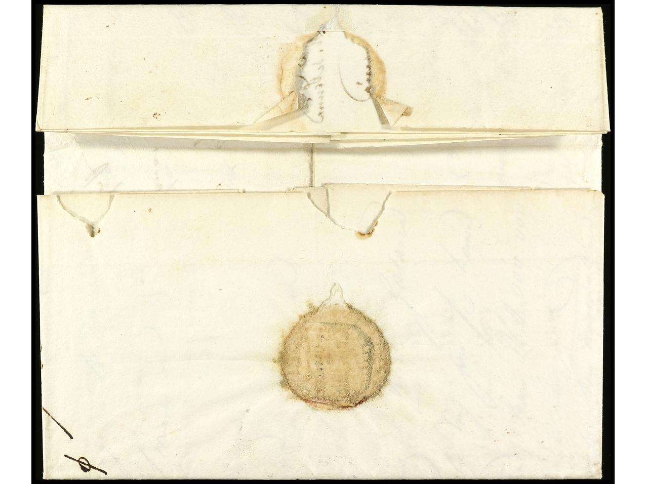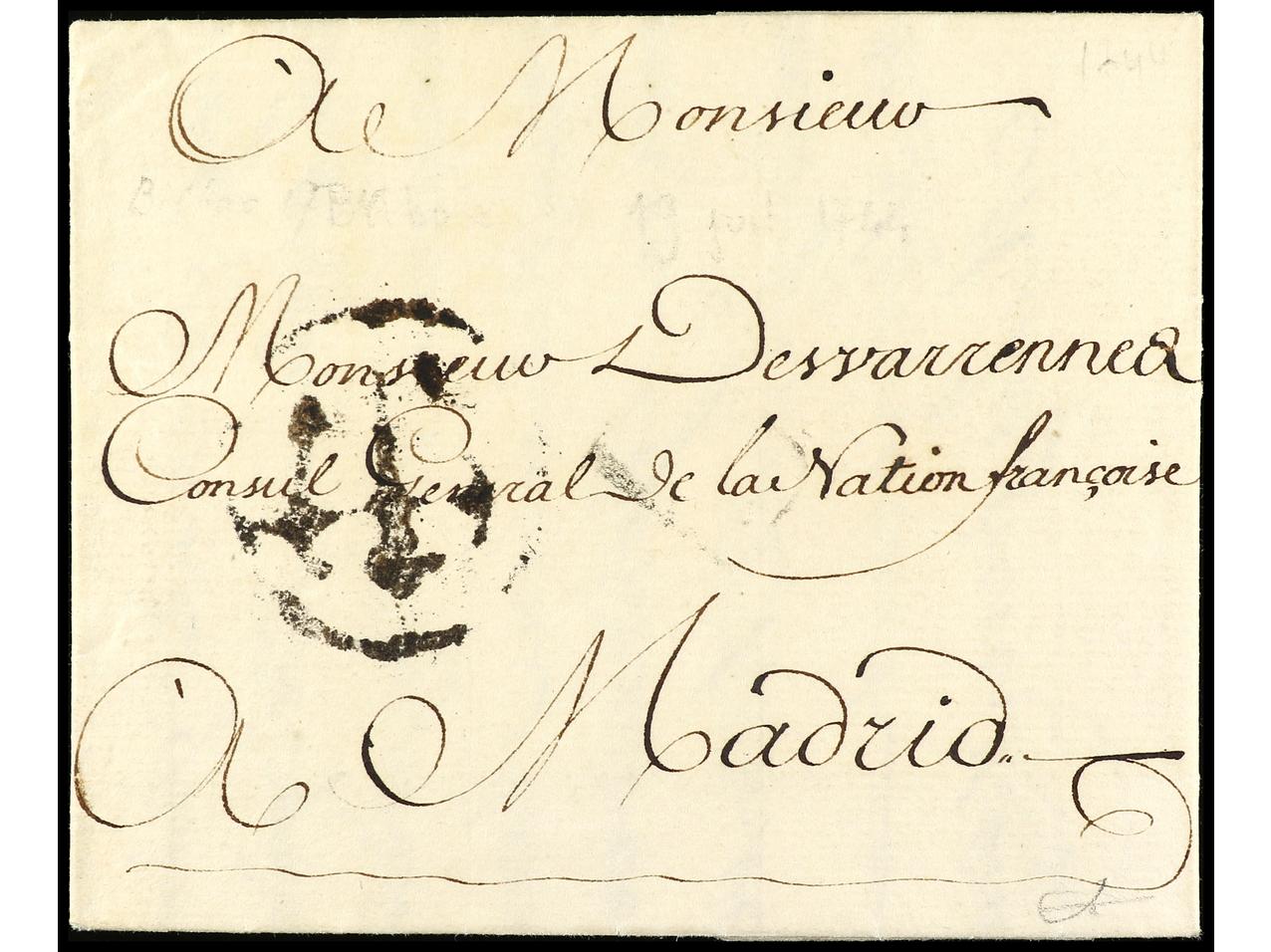 ESPAÑA: PREFILATELIA. 1744 (19 julio). BILBAO a MADRID. Marca CRUZ DE SANTIAGO en negro de Madrid (similar a la nº 111). PIEZA EXCEPCIONAL por ser la última fecha conocida de este tipo de marcas en Madrid. (Image1) (Image2)