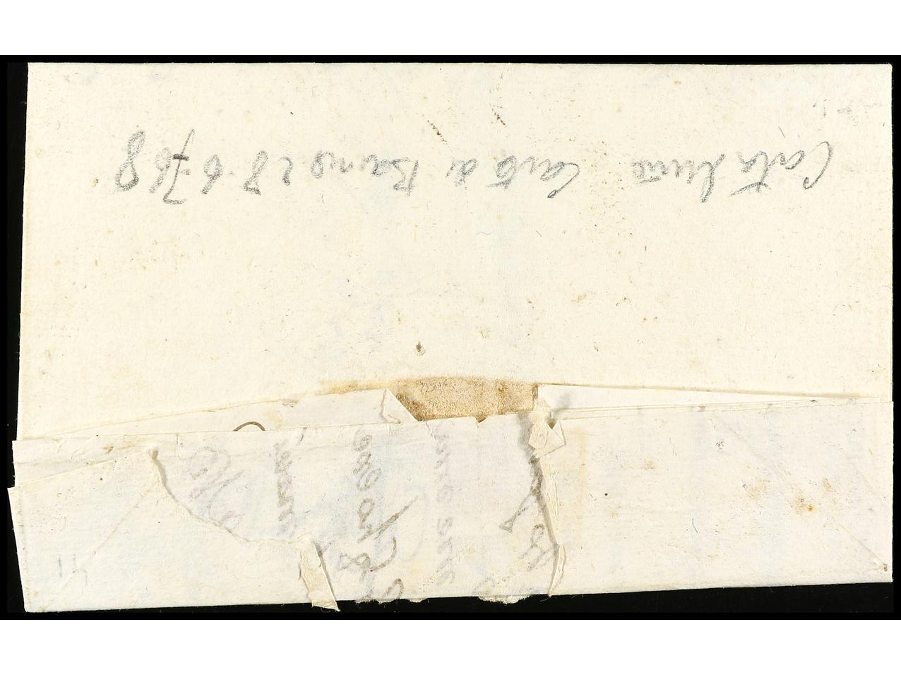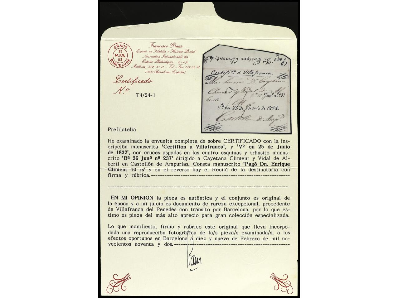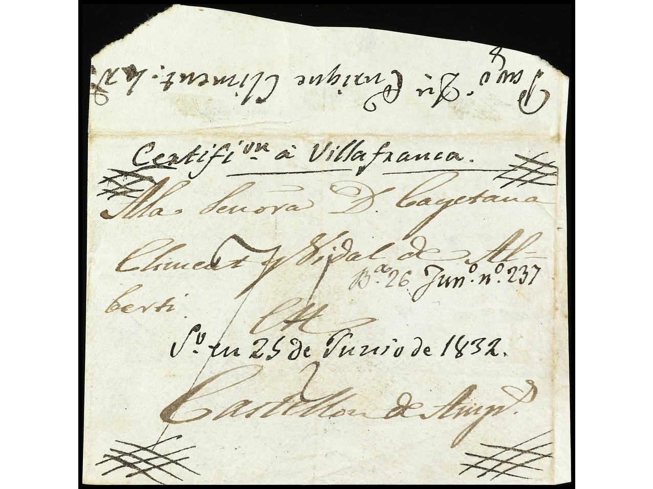 ESPAÑA: PREFILATELIA. 1832. VILAFRANCA DEL PENEDÉS. Frontal con ´recibí´ al dorso de VILLAFRANCA A CASTELLÓ DE AMPURIAS (P.E. 7). Manuscrito ´CERTIFI ON A VILLAFRANCA/ 5º EN 25 DE JUNIO DE 1832´. RARA. Cert. GRAUS. (Image1) (Image2)