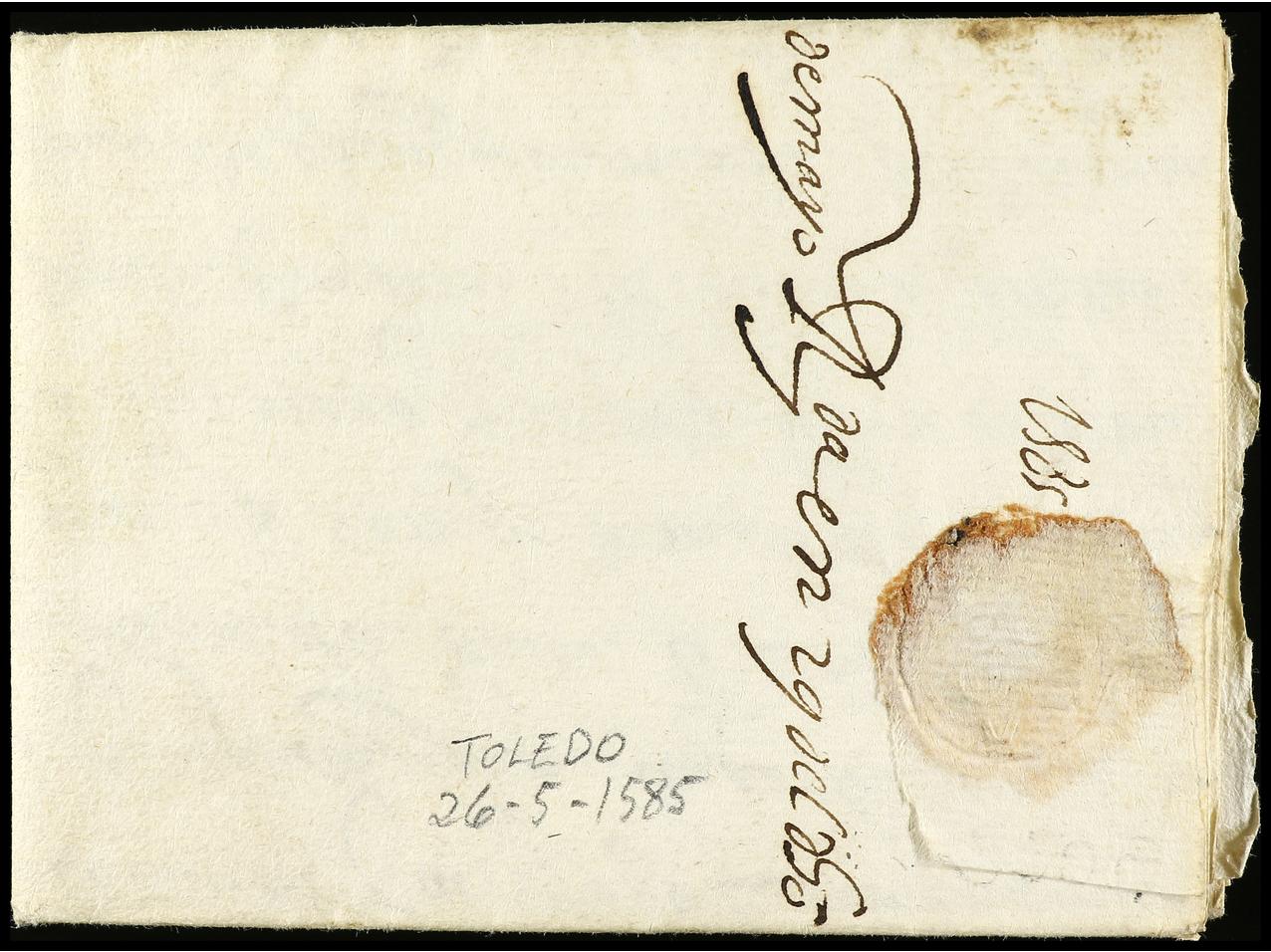 ESPAÑA: PREFILATELIA. 1585. TOLEDO a MADRID. Carta completa con texto, indicación manuscrita en la parte inferior probablemente de un encaminador. Rara en fecha tan temprana. (Image1) (Image2)