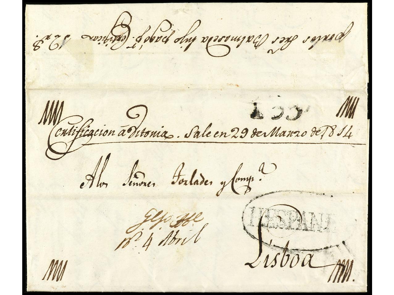 ESPAÑA: PREFILATELIA. 1814 (26 Marzo). VITORIA. Sobrescrito de VITORIA a LISBOA. Manuscrito ´CERTIFICACION A VITORIA. SALE EN 29 DE MARZO DE 1814´ y marca de entrada en Portugal HESPANIA (P.E. 29). Rarísimos los certificados