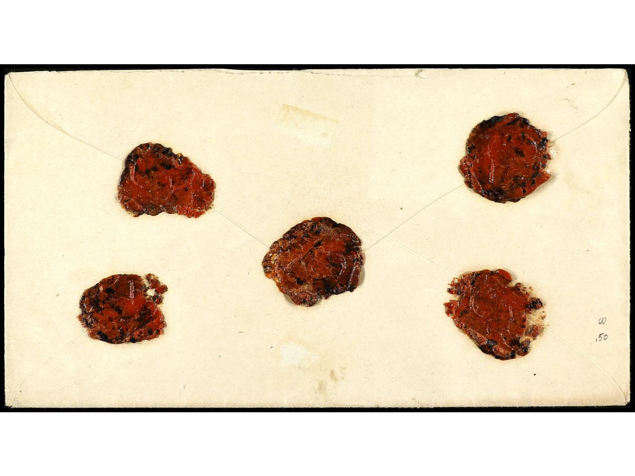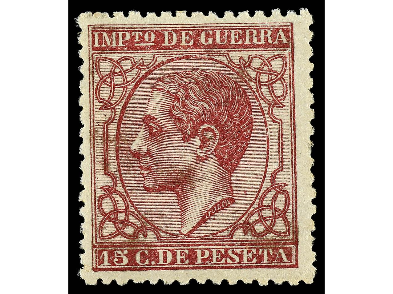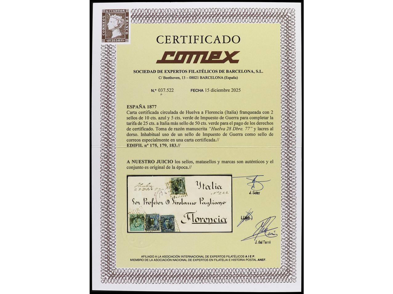 certificado, mat. rombo de puntos y toma de razón manuscrita ´Huelva 28 Dbre. 77´ y número de certificado ´222´. Muy rara combinación de franqueo usando el sello de Imp. de Guerra para el franqueo. A día de hoy franqueo único conocido. Cert.