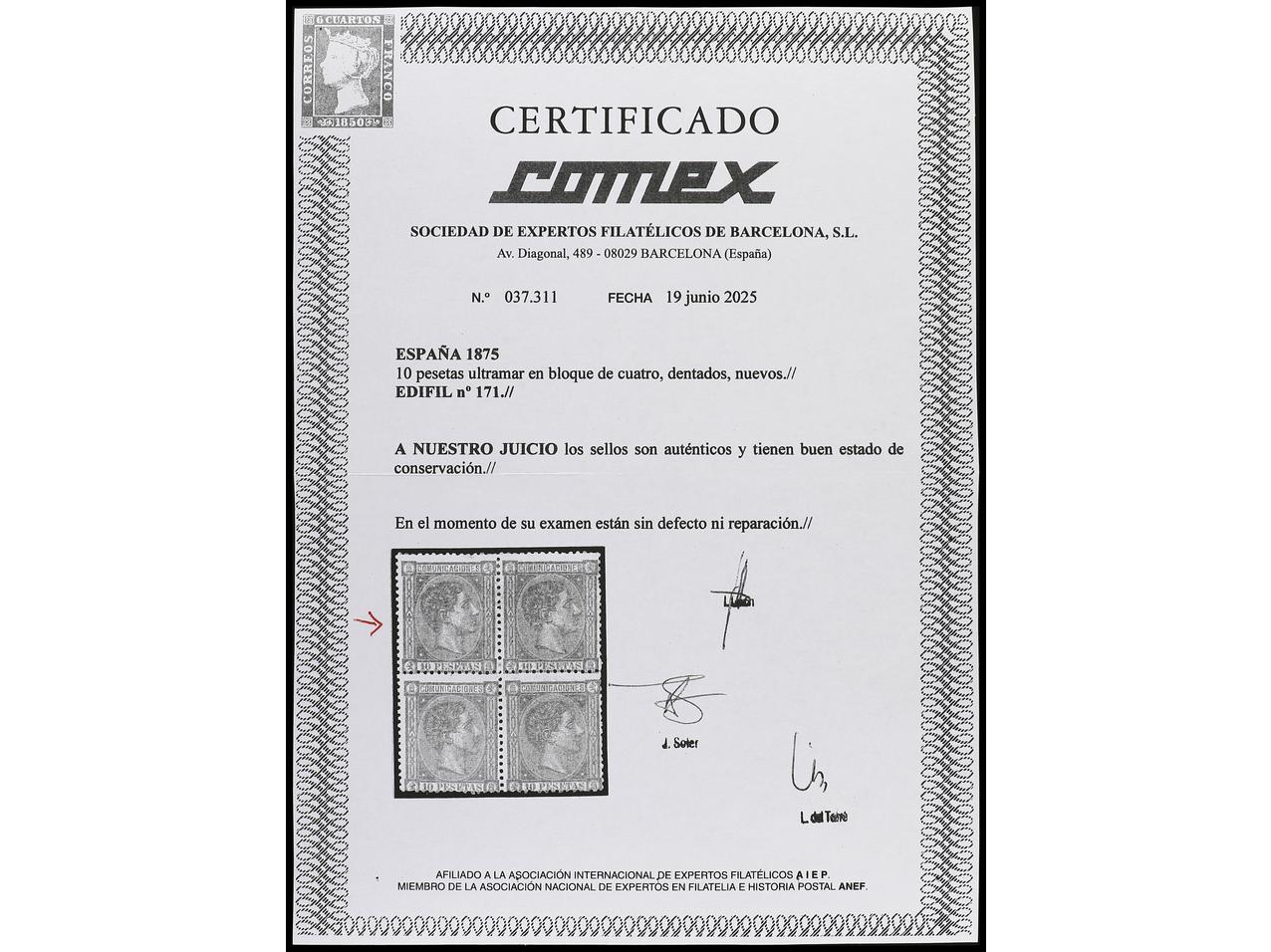 ESPAÑA. 10 pts. azul. Ejemplar de color muy fresco conservando toda la goma original. RARO. Cert. del bloque de cuatro de dónde procede (fotocopia). Ed.171. Cat. 1.500€. (Image1) (Image2)