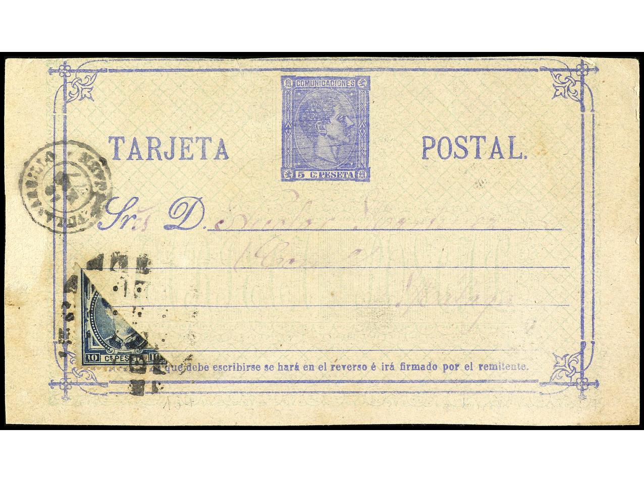 ESPAÑA. 1876. BARCELONA a GERONA. Tarjeta Postal de 5 c. azul y sello de Impuesto de Guerra de 5 c. verde, FALSO POSTAL, tipo III (Graus 259III). RARO. Ed.183 FP. (Image1) (Image2)