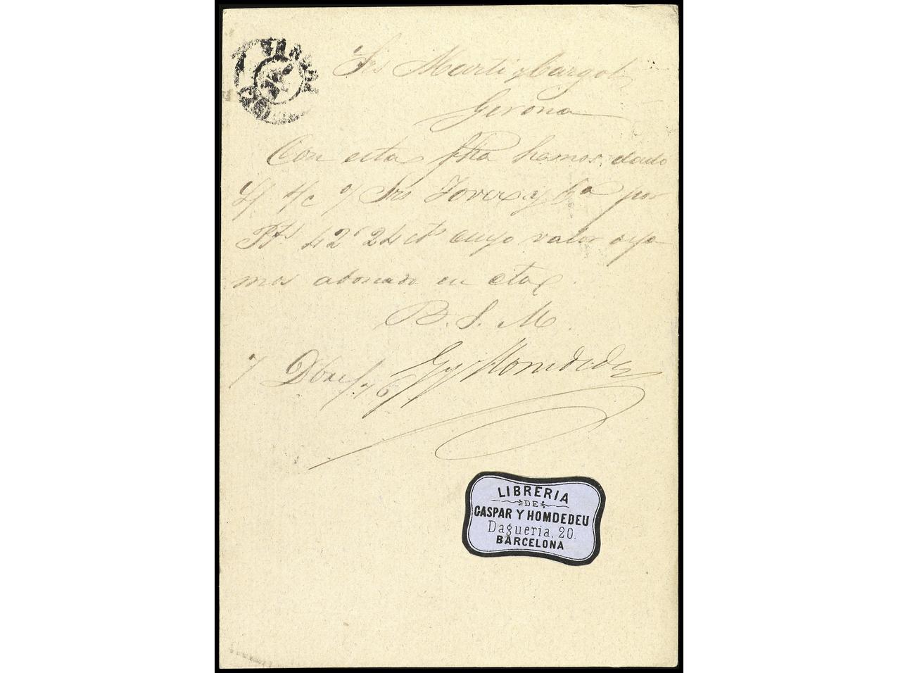 ESPAÑA. 1877 (20 Noviembre). SOBRE ANUNCIADOR vendido por PRAT y MATEOS en Barcelona con publicidad colectiva en el interior y en el reverso. Este tipo de sobres se vendían con los sellos adheridos, por un valor inferior al nominal, en