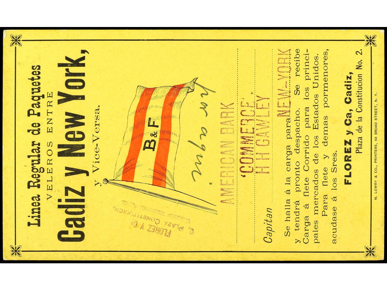 ESPAÑA. 1882. CÁDIZ a JEREZ. Tarjeta Postal bicolor de Florez y Cia. de Cádiz circulada con sello de 1/4 cto. verde circulada en la época de prohibición del uso de tarjetas postales particulares. MUY RARO. Ex. col. J. SOLER. Ed.173. (Image1) (Image2)