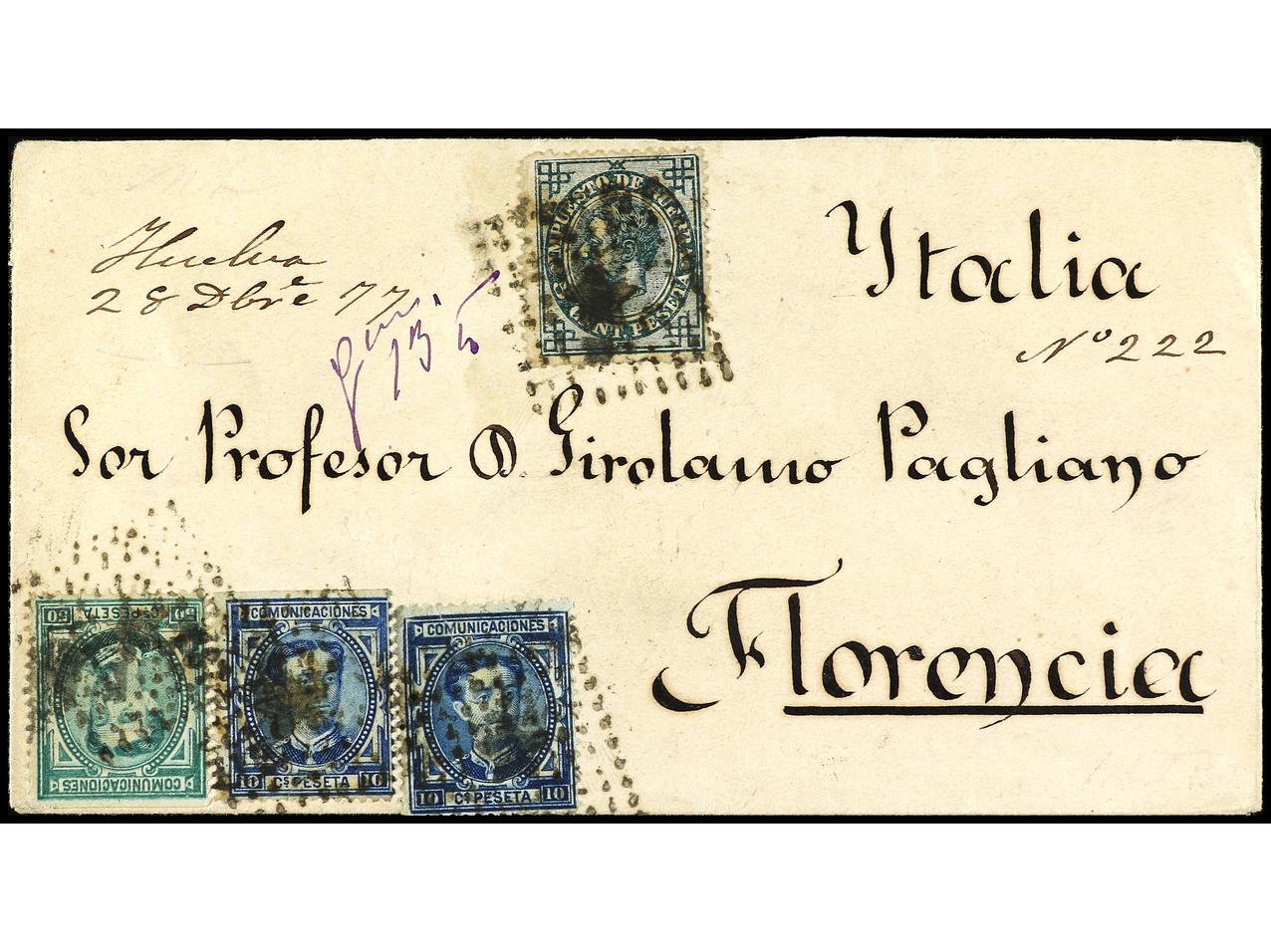 ESPAÑA. 1877. HUELVA a FLORENCIA. Carta CERTIFICADA franqueada con sellos de 10 cts. azul (2) y sello de Imp. de Guerra de 5 cts. verde completando el porte de 25 cts. a Italia más sello de 50 cts. verde para el pago de los derechos de
