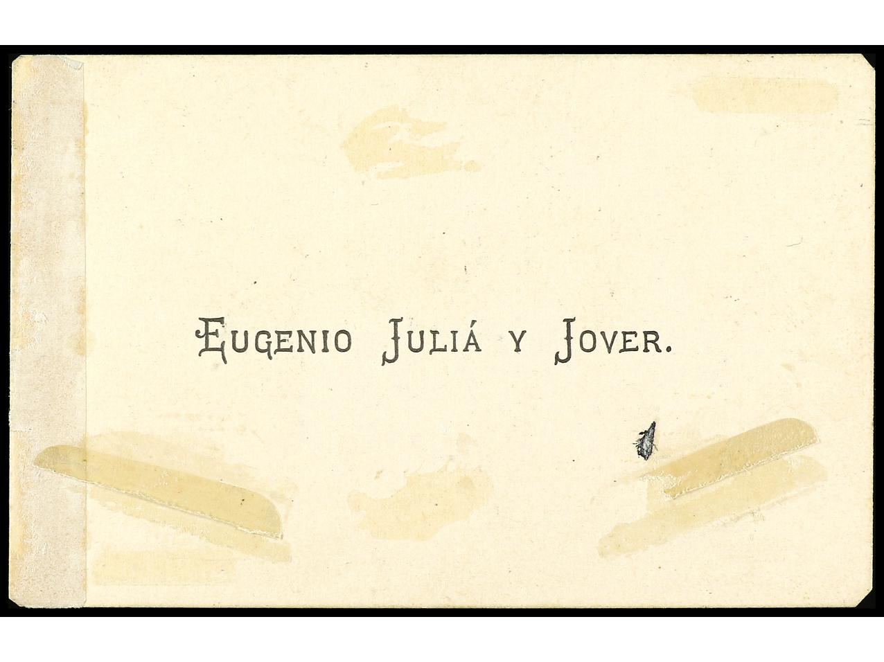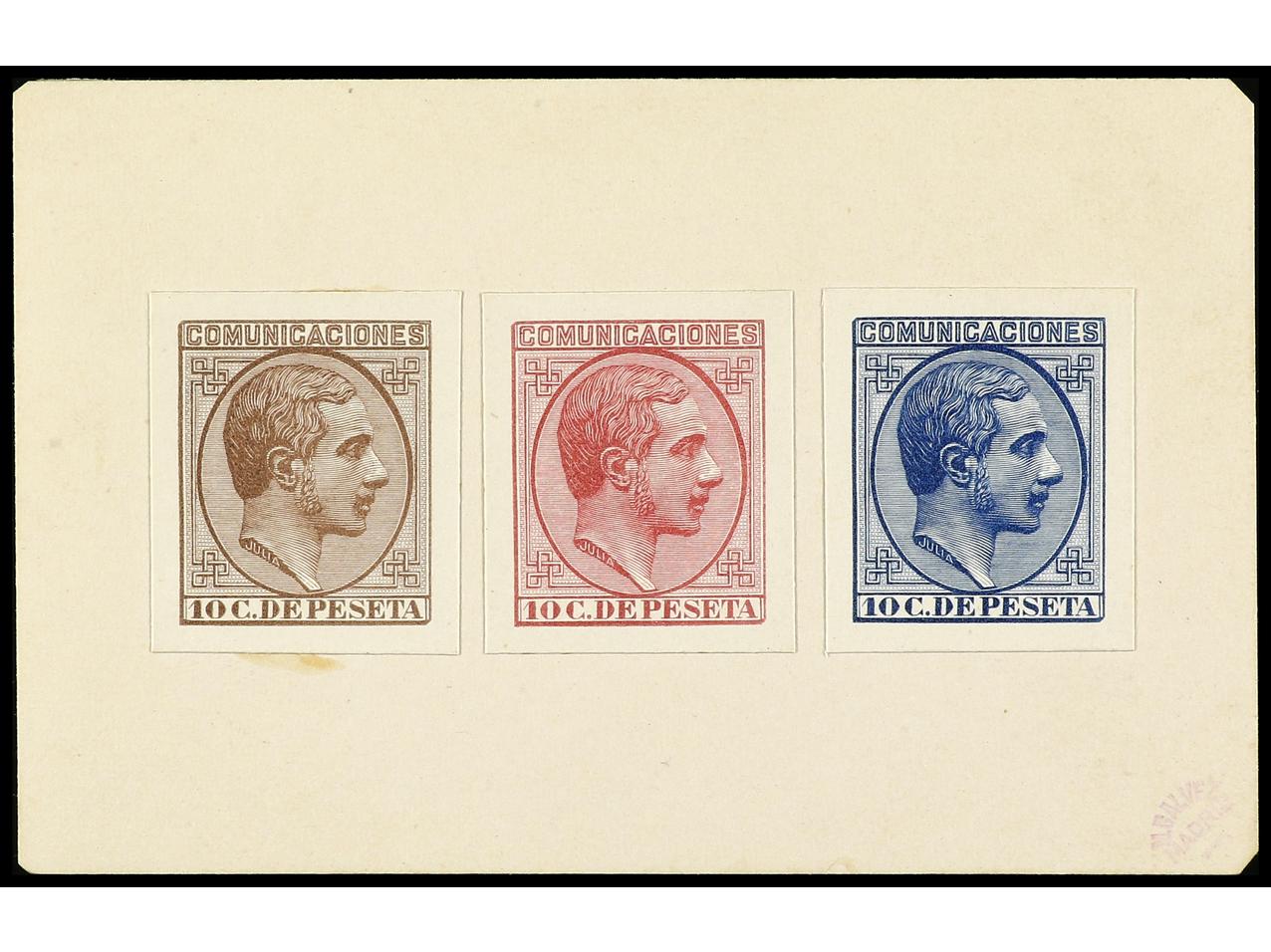 ESPAÑA. 1878. 10 cts. castaño, 10 cts. carmín y 10 cts. azul PRUEBAS DE PUNZÓN adheridas sobre tarjeta de visita de Eugenio Juliá Jover grabador del sello. MUY INTERESANTE. (Gálvez 1044, 1054, 1064). Ed.192. (Image1) (Image2)
