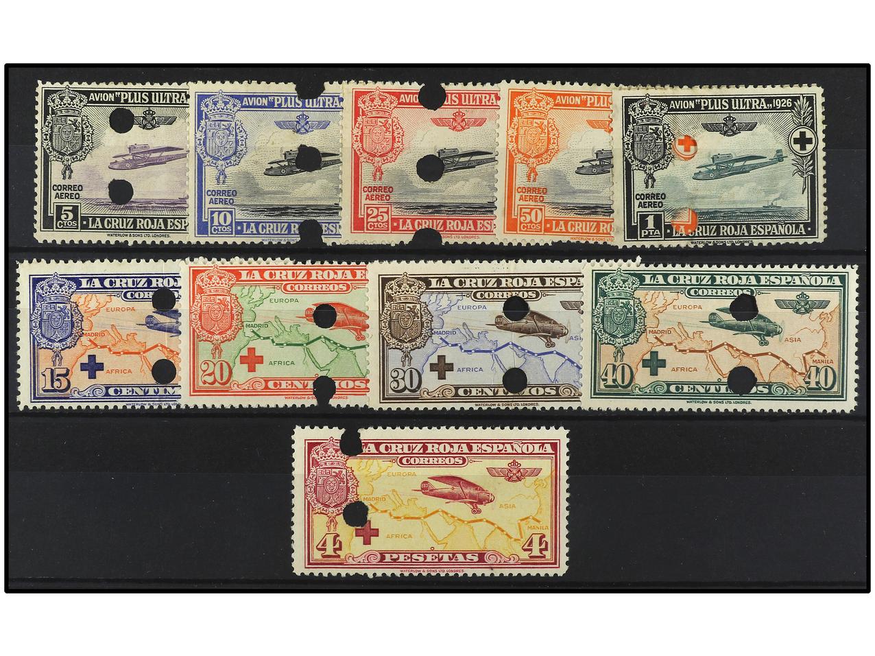 del tiraje definitivo, el 40 cts. algunos pliegues. CONJUNTO ESPECTACULAR, estas variedades sólo existen así con el taladro. Ed.325/38aMTs. Cat. 1.200€.