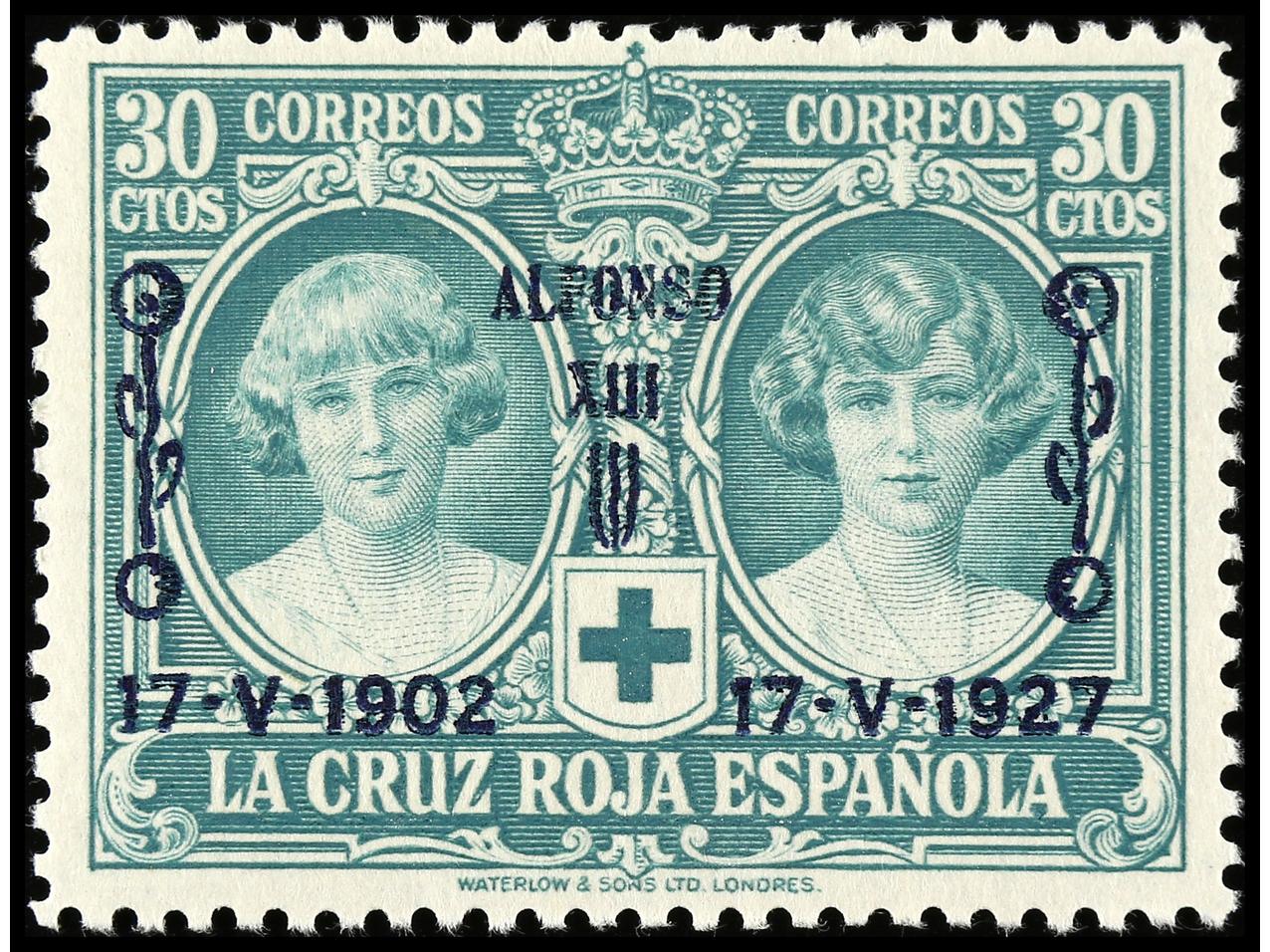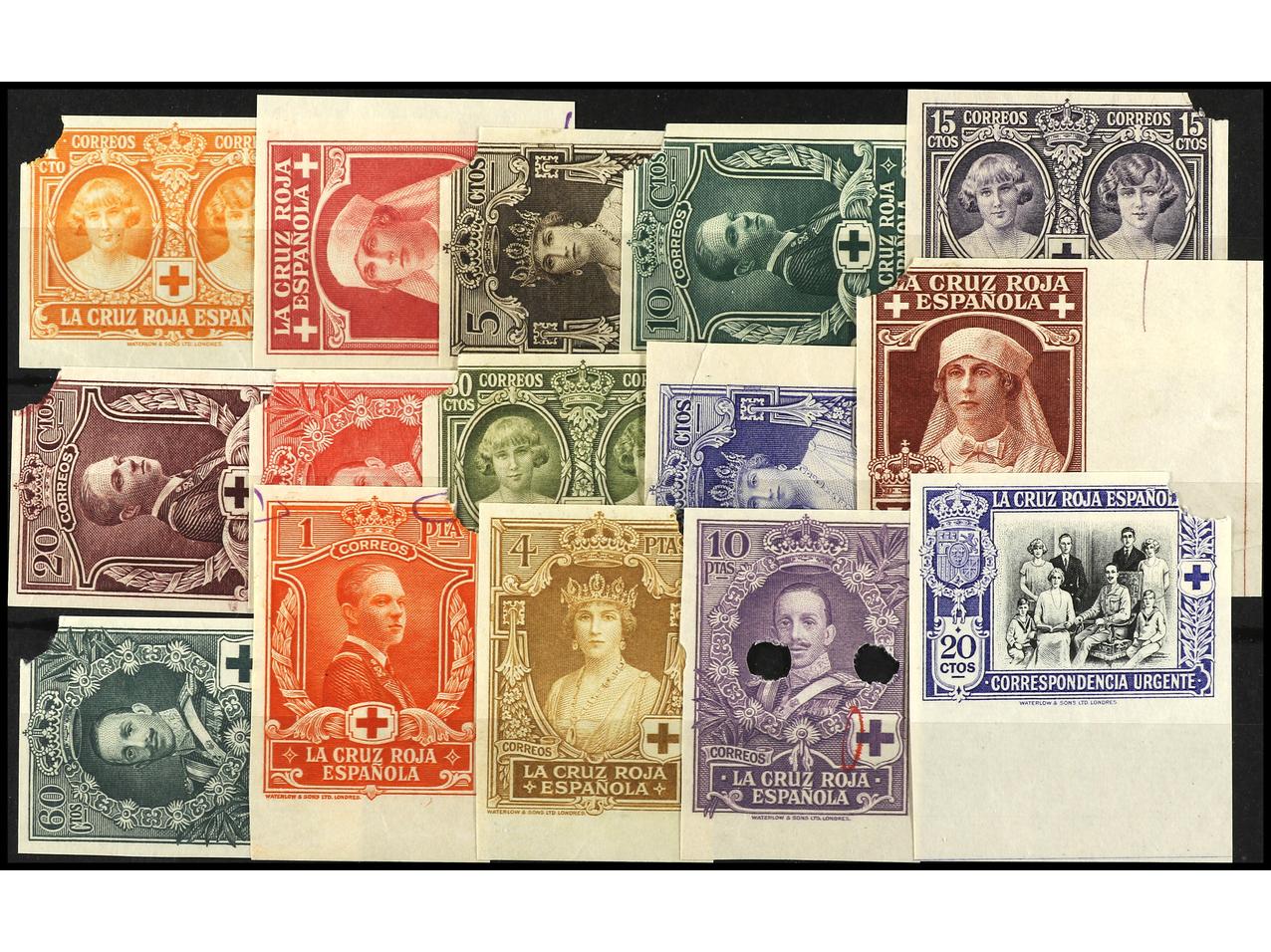 ESPAÑA. SERIE COMPLETA. CAMBIOS DE COLOR con los adoptados para las Colonias Españolas sin la habilitación, sellos sin dentar y con taladro angular, procedentes de las hojas de trabajo de la imprenta con algunas correcciones a tinta antes