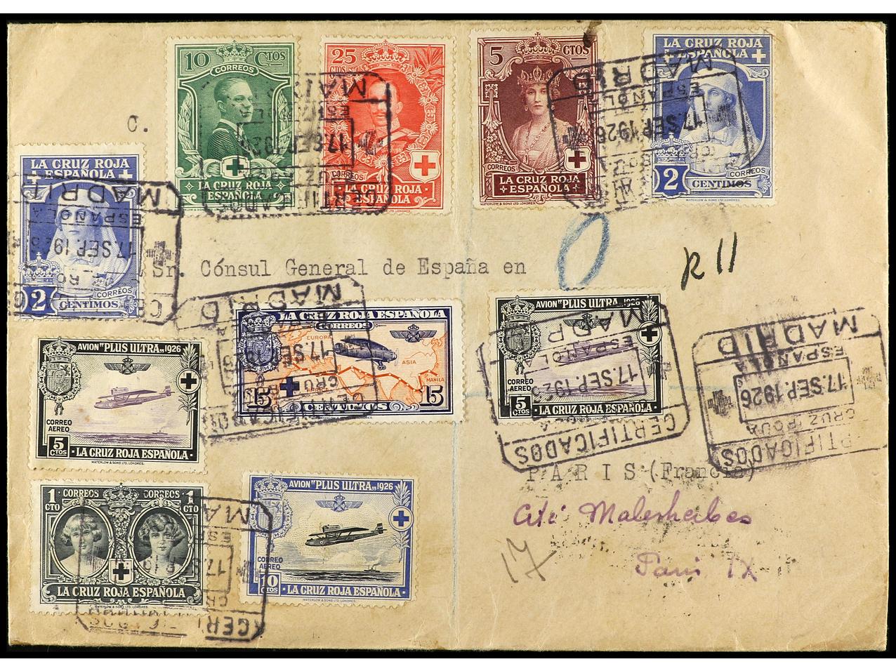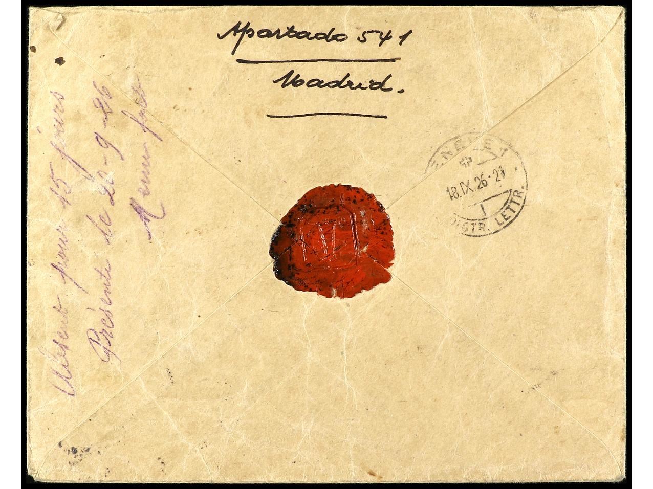 ESPAÑA. 1926. MADRID a PARÍS. Carta certificada de espectacular franqueo, al dorso llegada. Ed.325, 326 (2), 327/28, 331, 339 (2), 340/41. (Image1) (Image2)