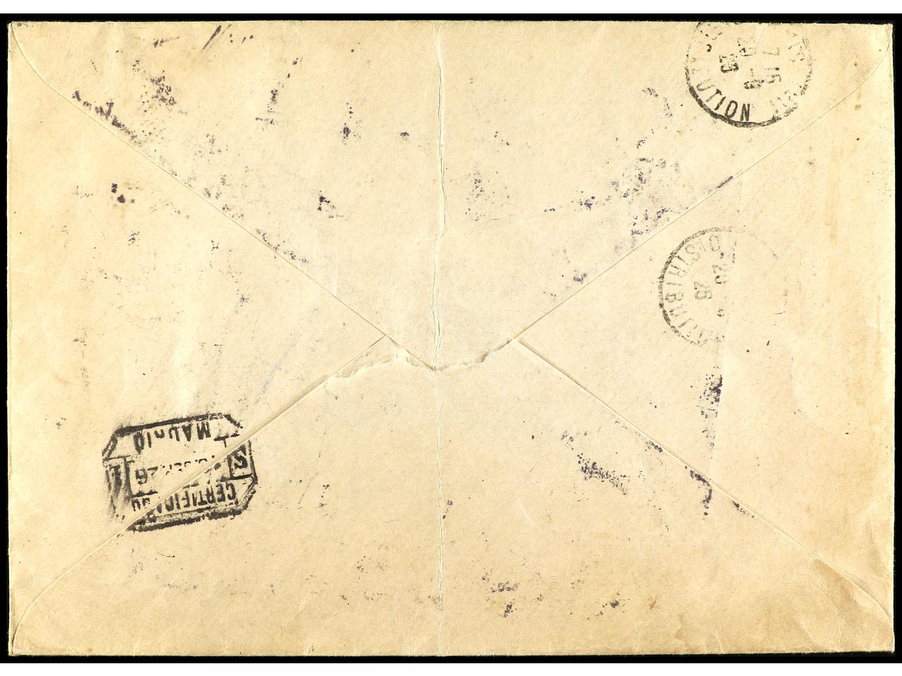 ESPAÑA. 1926. MADRID a GALANG (Sumatra). 5 cts. castaño violeta, 25 cts. carmín y 50 cts. naranja. Carta certificada, al dorso llegada. Rara destinación. Ed.327, 331, 334. (Image1) (Image2)