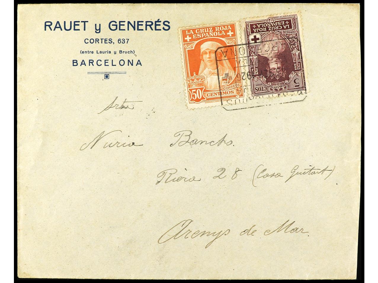 ESPAÑA. 1926. BARCELONA a ARENYS DE MAR. 5 cts. castaño violeta y 50 cts. naranja. Carta certificada, al dorso llegada. Ed.327, 334. (Image1) (Image2)