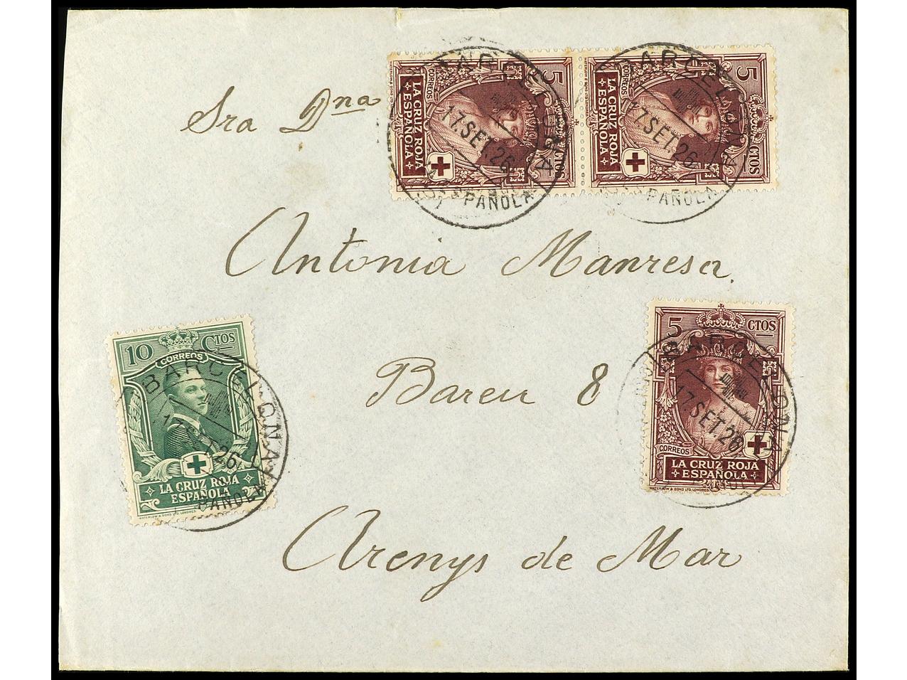ESPAÑA. 1926. BARCELONA a ARENYS DE MAR. 5 cts. (3), 10 cts. Al dorso llegada. Ed.327 (3), 328. (Image1) (Image2)