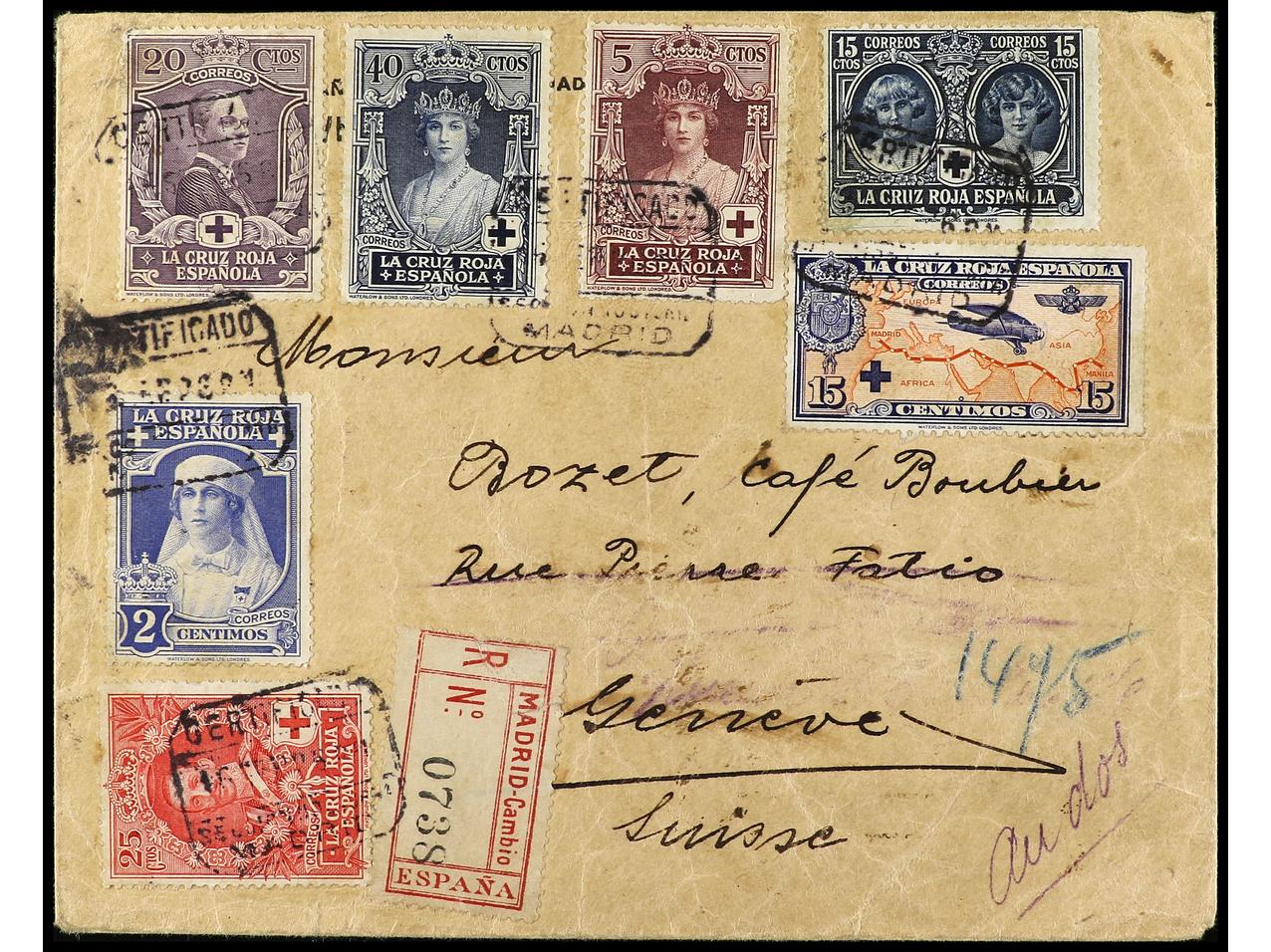 ESPAÑA. 1926. MADRID a SUIZA. Carta certificada, precioso franqueo, al dorso llegada. Ed.326/27, 329/33, 341. (Image1) (Image2)