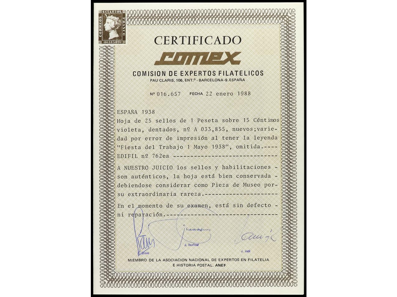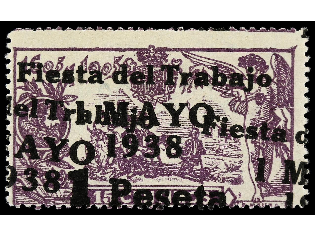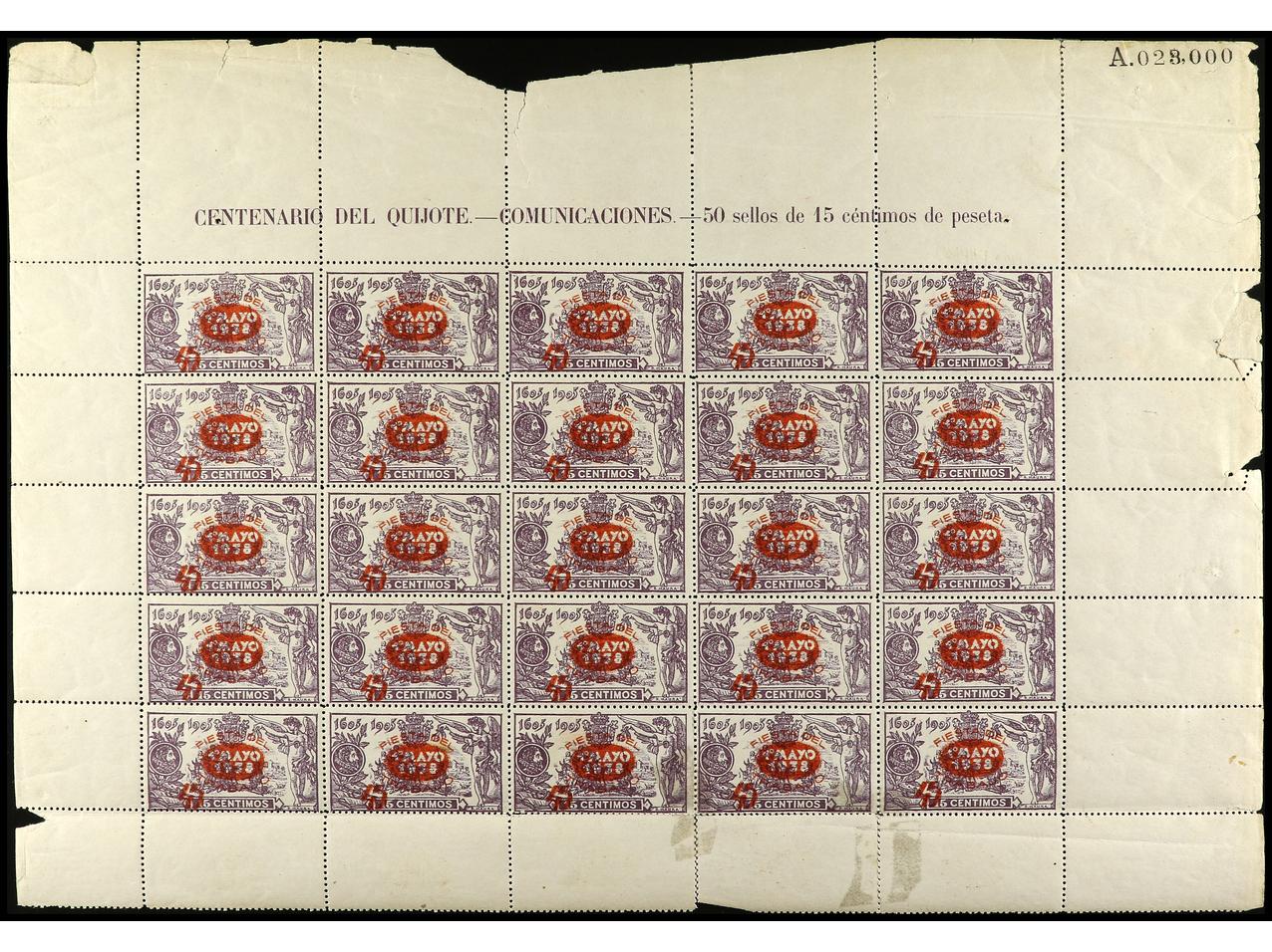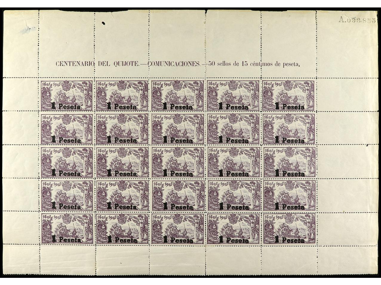 ESPAÑA. 1 pta. s. 15 cts. violeta SIN HABILITACIÓN FIESTA DE TRABAJO/1-MAYO. Hoja de 25 sellos, al dorso numeración A033,855. RARA. Cert. COMEX. Ed.762hpa. Cat. 6.875€. (Image1) (Image2)