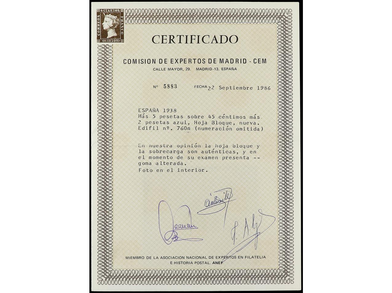 ESPAÑA. HB Aéreo + 5 pts. SIN NUMERACIÓN. Goma no original. Cert. CEM. Ed.760n. Cat. 2.900€. (Image1) (Image2)