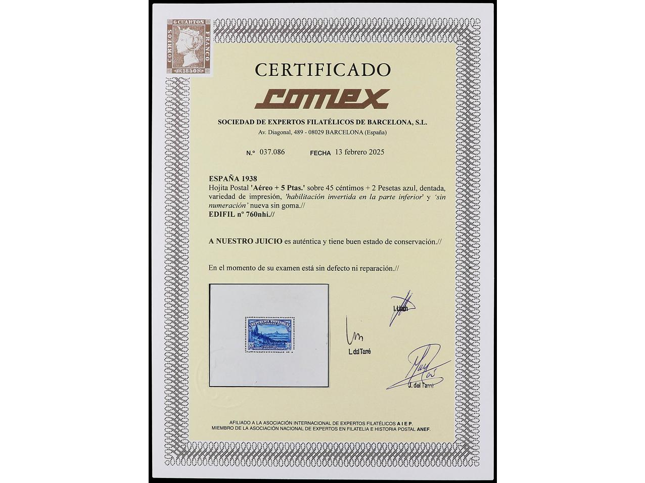 ESPAÑA. HB. Aéreo + 5 pts. HABILITACIÓN INVERTIDA y SIN NUMERACIÓN. MUY RARA. Cert. COMEX. Ed.760nhi. (Image1) (Image2)
