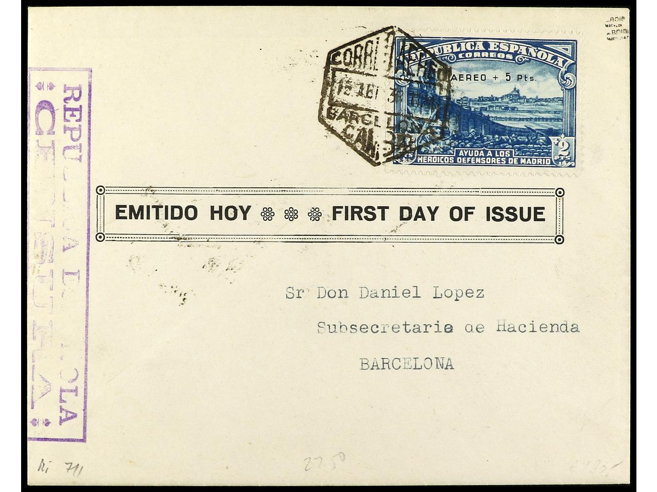 ESPAÑA. 1938. Aéreo + 5 pts. azul en sobre con mat. de primer día. Firmado ROIG. Ed.759. (Image1) (Image2)