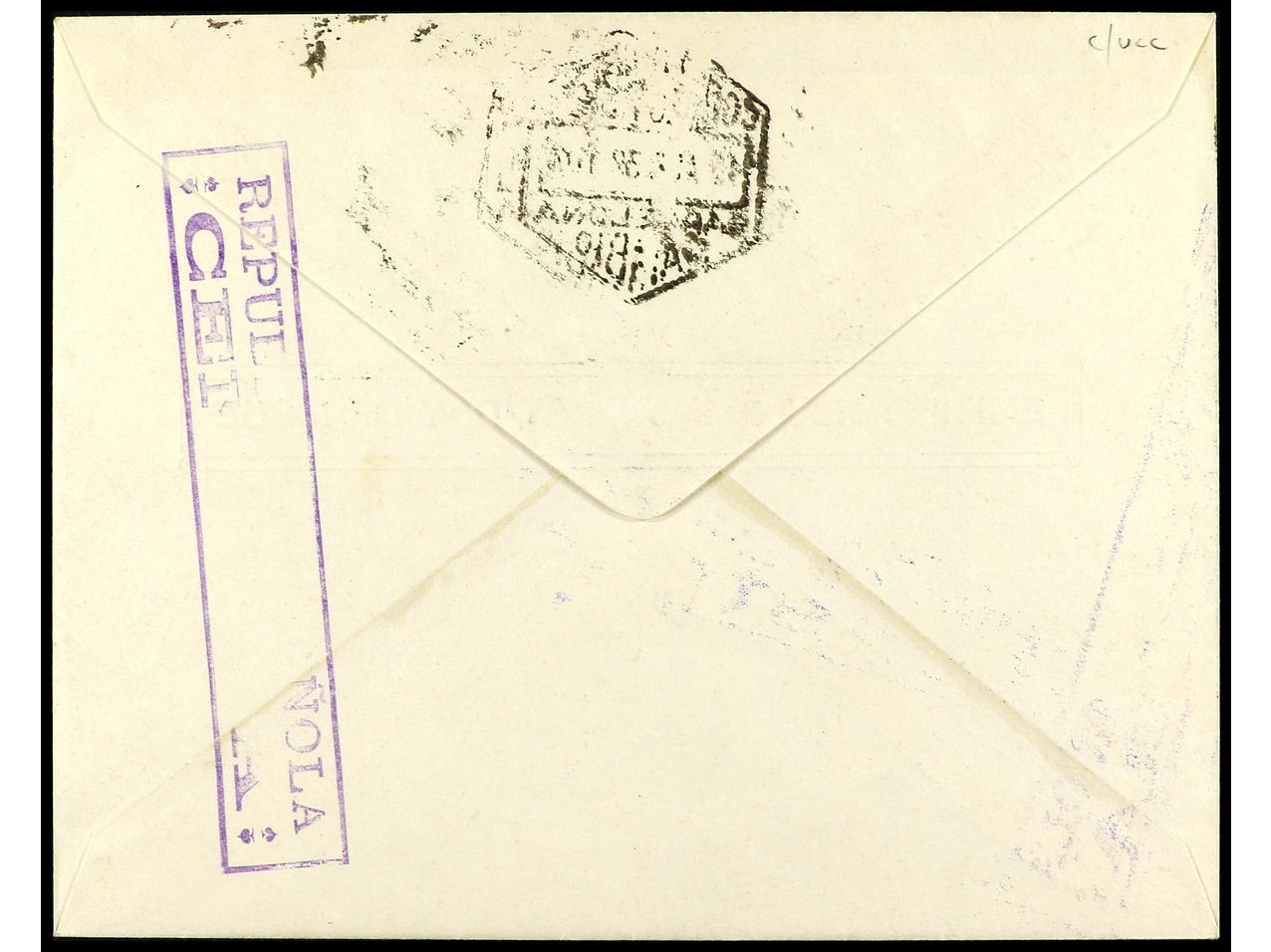 ESPAÑA. 1938. BARCELONA a NEW YORK. Aéreo + 5 pts. multicolor y al dorso la HB. 45 cts. + 2 pts. en color verdoso. RARÍSIMA, sólo existen 100 HB y en carta circulada probablemente es la única. (Reproducida en la pag. 513 de la Obra de O.