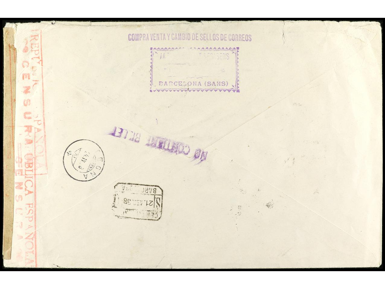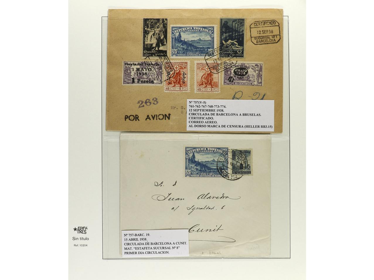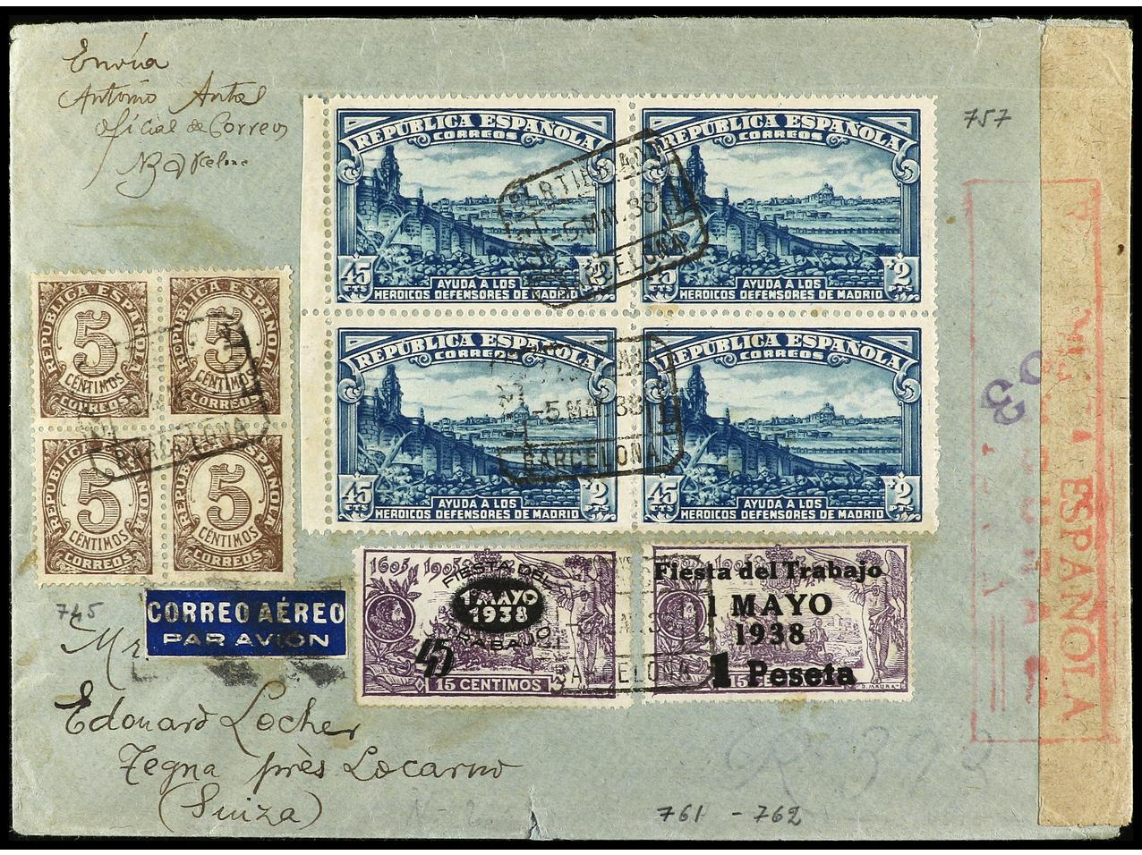 ESPAÑA. 1938. BARCELONA a SUIZA. Carta certificada, precioso franqueo, al dorso llegada. Ed.757 (4), 745 (4), 761/62. (Image1) (Image2)