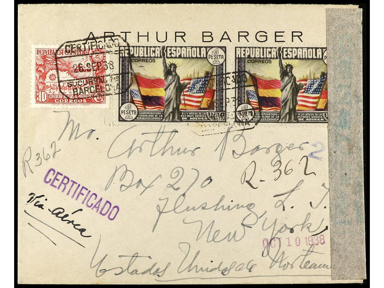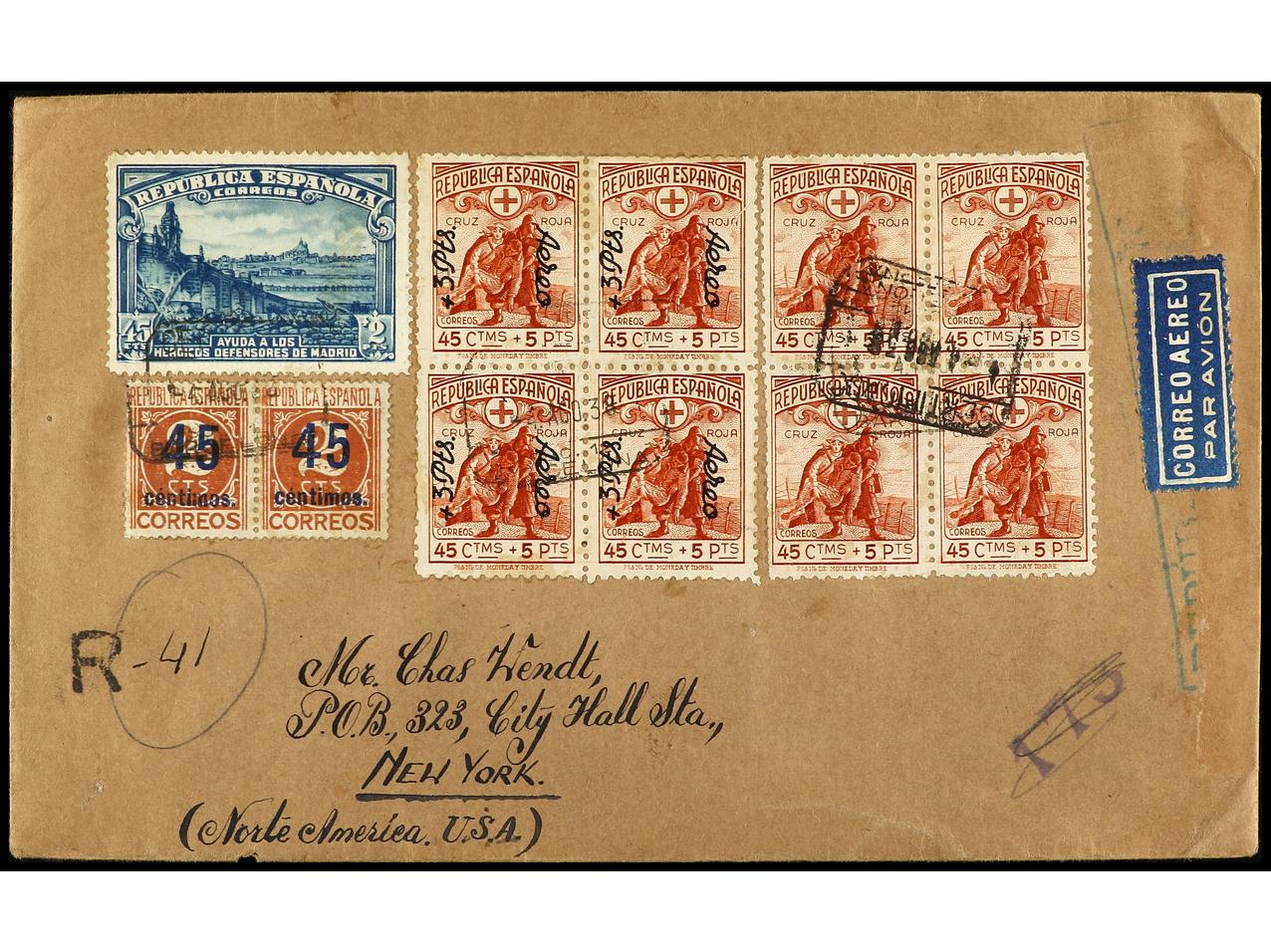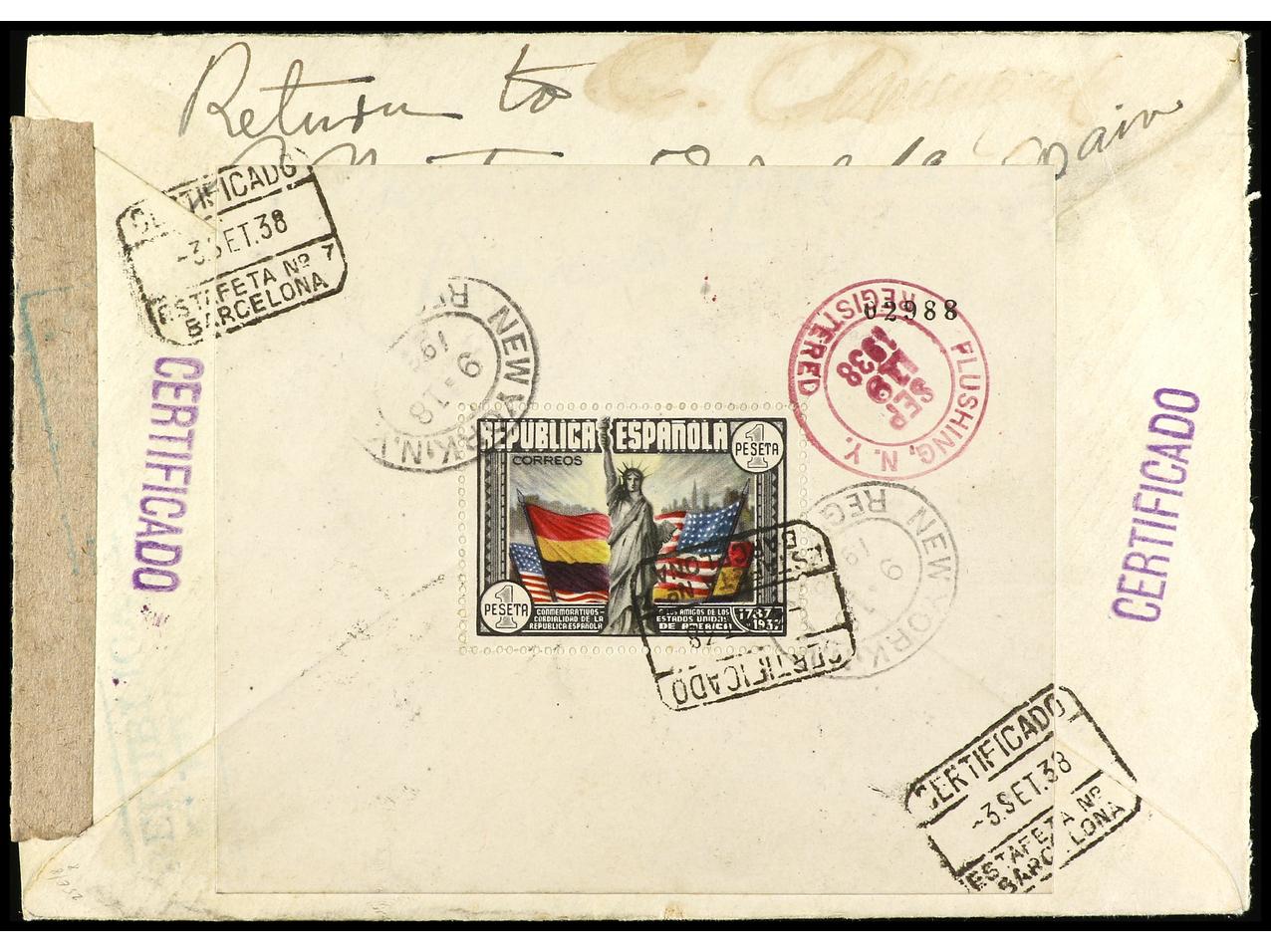 ESPAÑA. 1938. BARCELONA a NEW YORK. 1 pta. multicolor (2), 30 cts. carmín, al dorso bloque de cuatro del 45 cts. + 2 pts. azul verdoso. Carta certificada, muy raro franqueo, al dorso llegada. Ed.763 (2), 757a (4). (Image1) (Image2)
