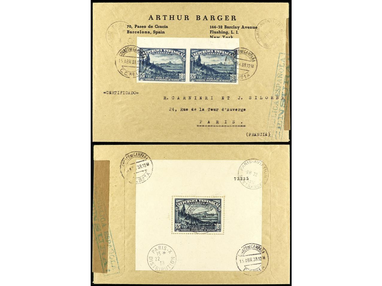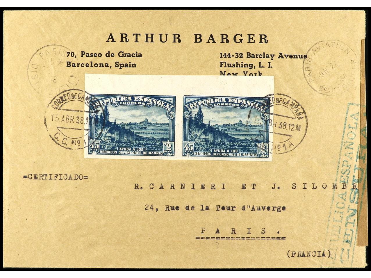 ESPAÑA. 1938. Circulada desde el frente a PARÍS. 45 cts. + 2 pts. azul pareja sin dentar y al dorso HB, mat. CORREO DE CAMPAÑA/C.C. Nº 1 al dorso llegada. Raro franqueo. Ed.757s (2), 758. (Image1) (Image2)